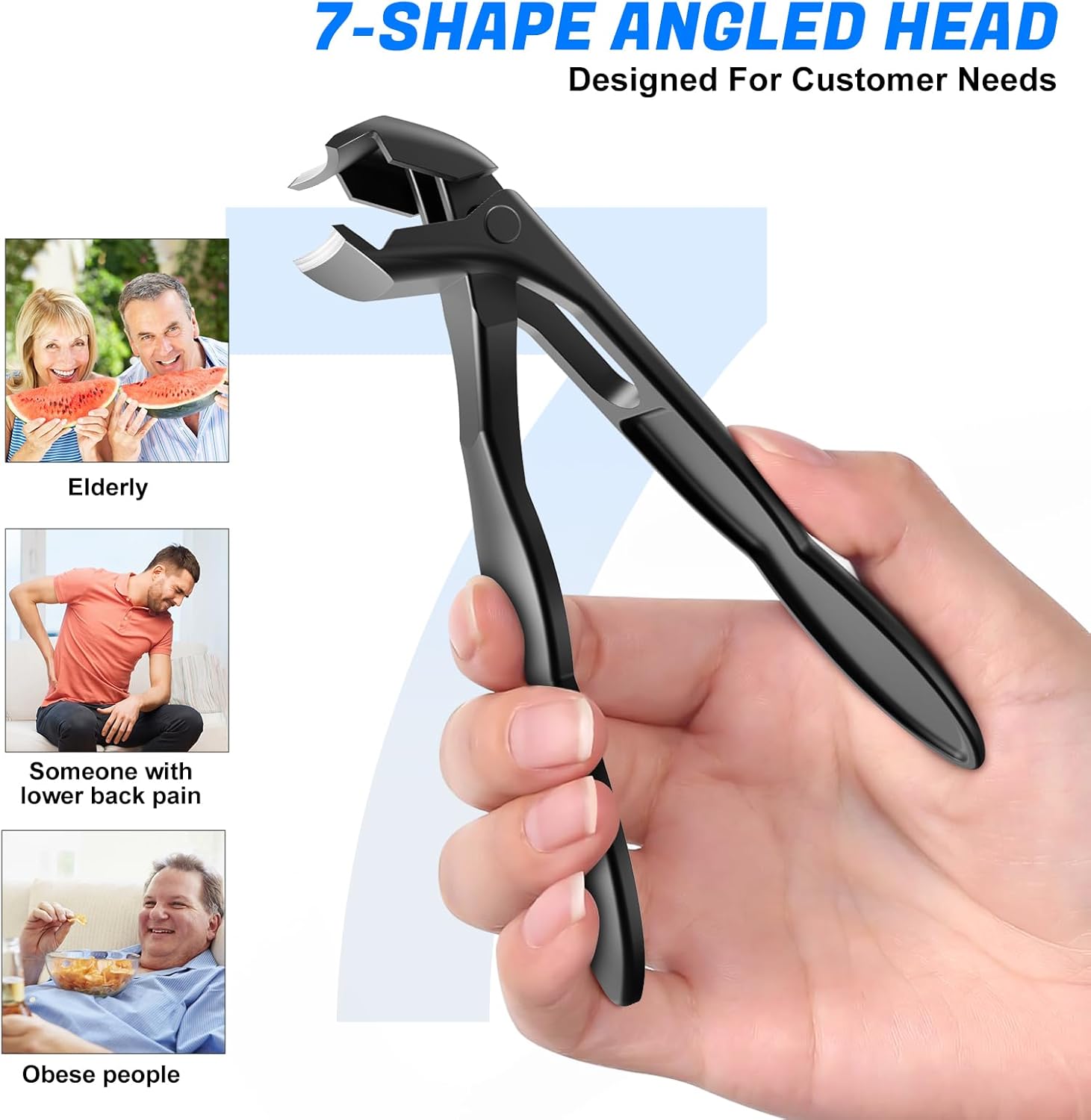 - 2025 UPGRADED ANGLED TOENAIL CLIPPERS - Toenail clippers for seniors Ergonomically designed with a bionic 7-shaped angled head, you can see the blade and nails clearly so you can cut your nails accurately and confidently. With this angled nail clipper, no more twisting and bending your body to cut your toenails, great for the elderly, men, women, adults, etc