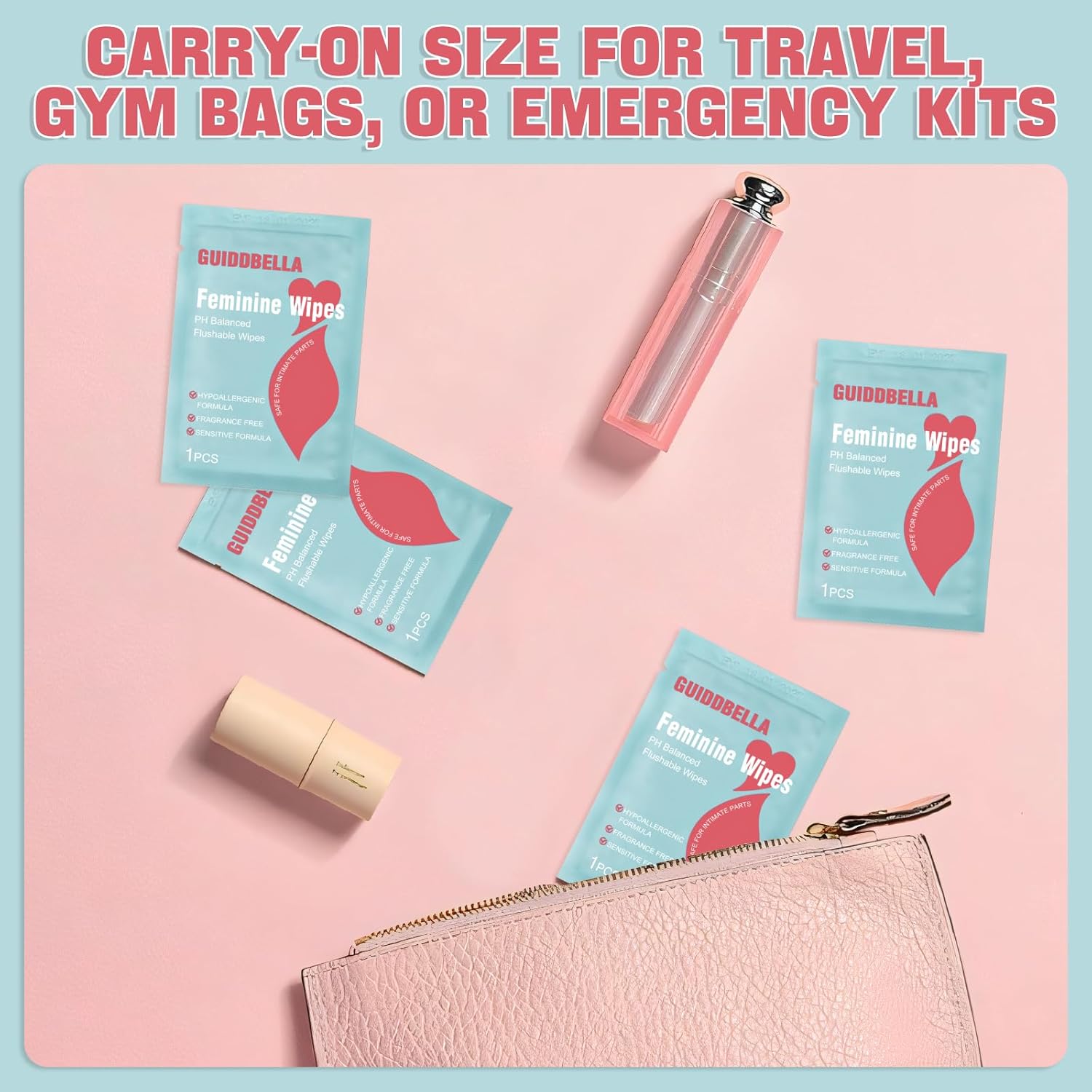 Feminine Wipes for Women - Individually Wrapped Flushable Wipes, PH-Balanced, Alcohol-Free, Unscented, Safe for Sensitive Skin (50 Count)