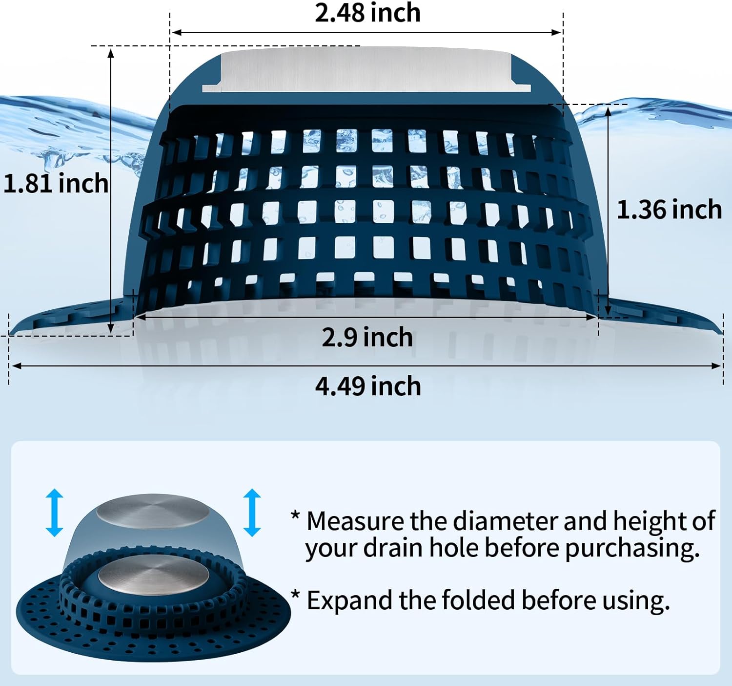 - Foldable Silicone - Just restore the folded to dome before using. Suitable for bathtubs, showers, sinks or laundry. Resists rust for long-term use.