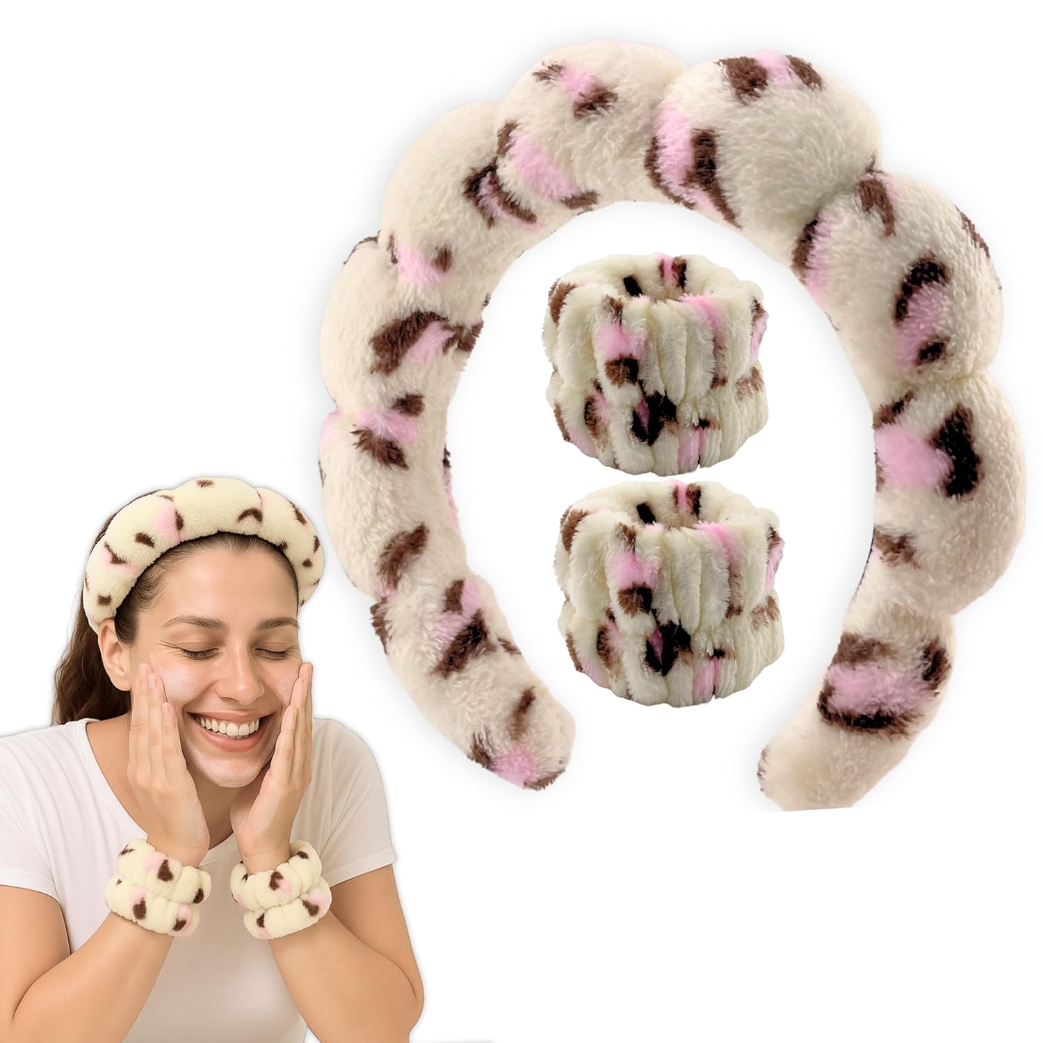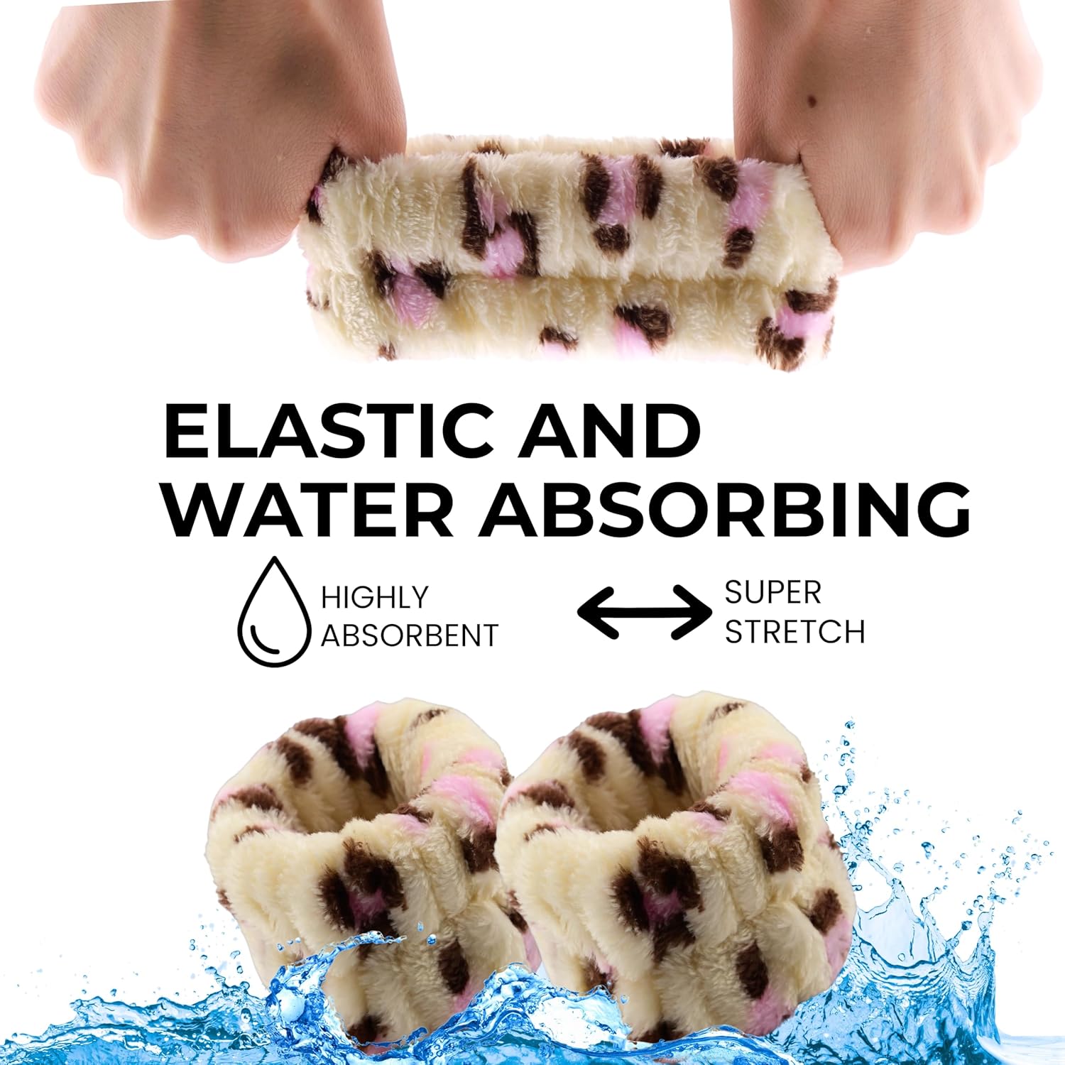 Spa Headband Wrist Band for washing face set Sponge Makeup Skincare Headband Wrist Towels Bubble Soft Terry Towel Cloth Hairband for Women Puffy Headwear Non Slip Thick Thin Hair Headwear (Leopard)