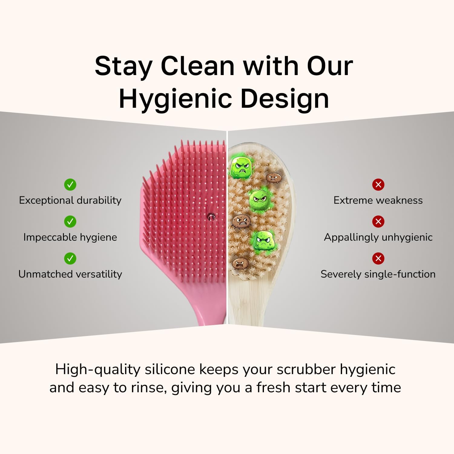 Silicone Back Scrubber with Long Handle - Octagon Body Brush for Shower, Bath, and Exfoliating - Skin Cleansing, Back Scrub and Gentle Silicone Sponge - Wash Your Body with Easy Reach - Rose