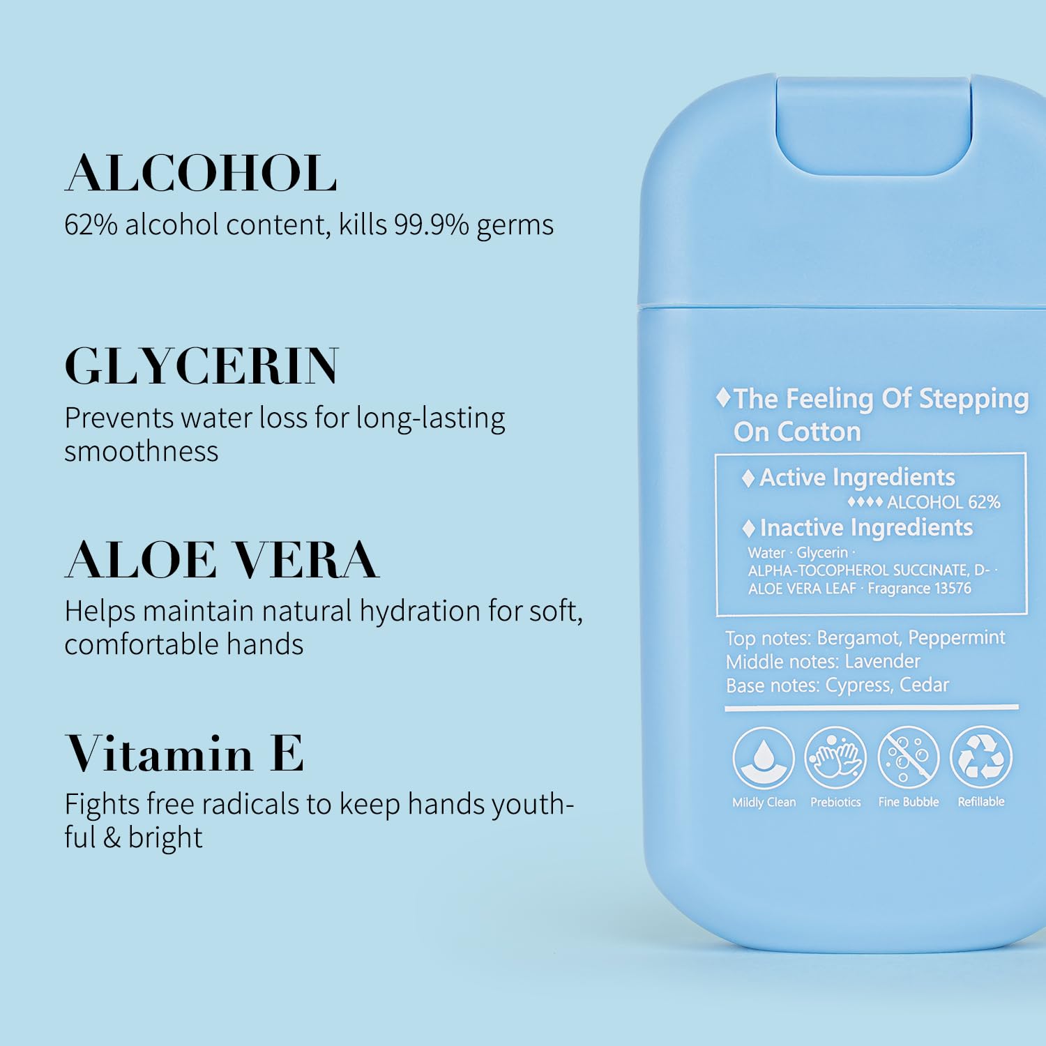 - SKINCARE FOR YOUR HANDS: Refreshing scented liquid hand soap with 62% alcohol content that kills 99.9% of germs, providing effective antibacterial protection while leaving hands softly fragrant. The mist contains hydrating ingredients like glycerin and aloe vera prevents dryness while leaving skin soft and non-sticky. Stay refreshed and germ-free wherever life takes you!
