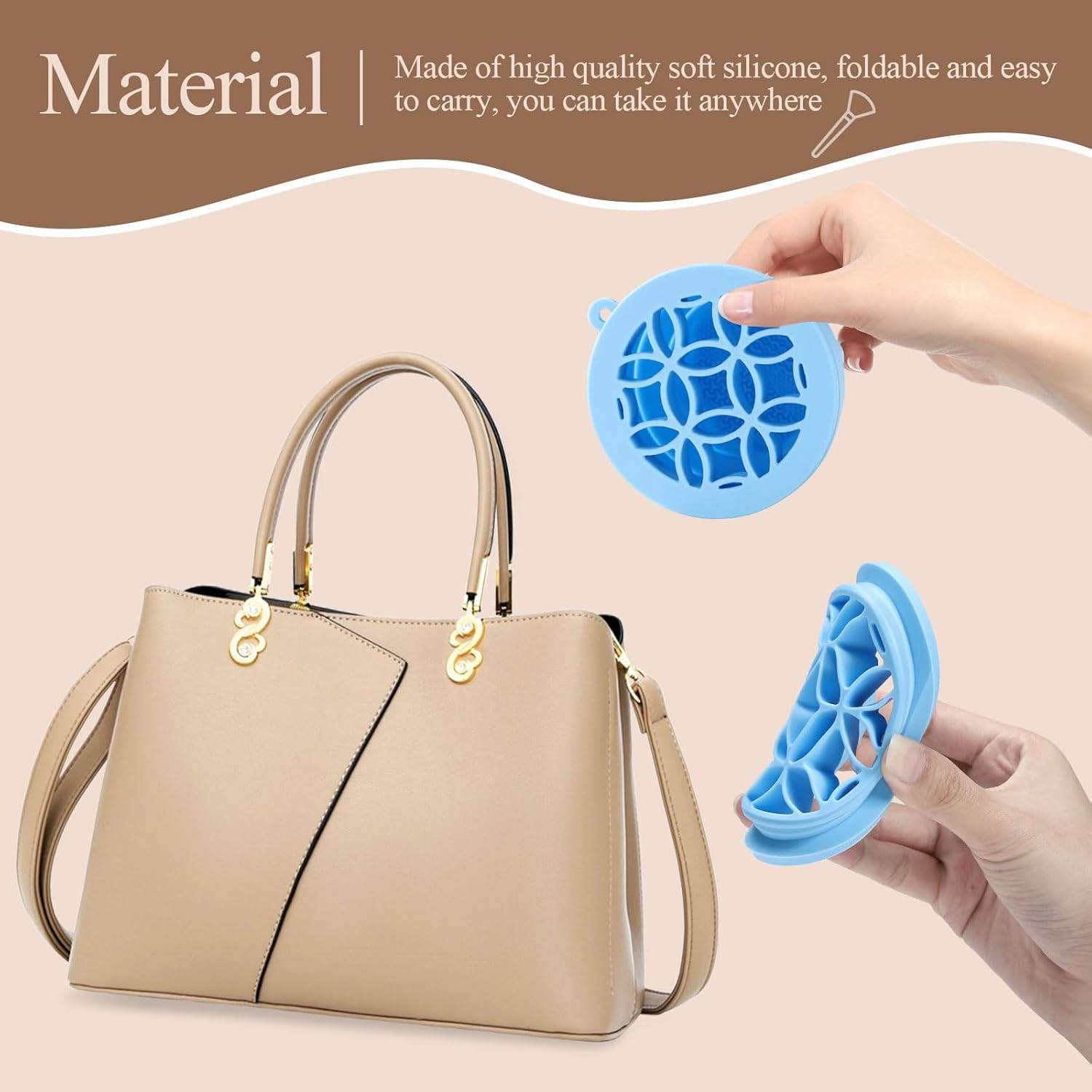- Lightweight and portable: Folding size: 4*3.5*1.7 inch (10*9*4.3cm); Expanded size: 4*2.6*3.3 inch (10*6.5*8.5 cm). Our compact silicone makeup brush cleaner folds flat for easy storage and fits perfectly in any purse or bag, allowing you to clean brushes anywhere. Makeup cleaner perfect for home use and travel. The makeup brush holder has holes for the hook to use and can be hung up to dry when not in use