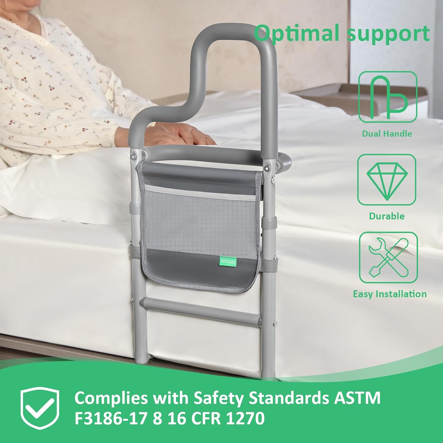 Dual Bar Bed Rail for Elderly Adults Safety with Storage Pocket, Bed Assist Rail for Seniors for Easily Getting in & Out of Bed, Bed Rails Fits King, Queen, Full, Twin Bed - Grey