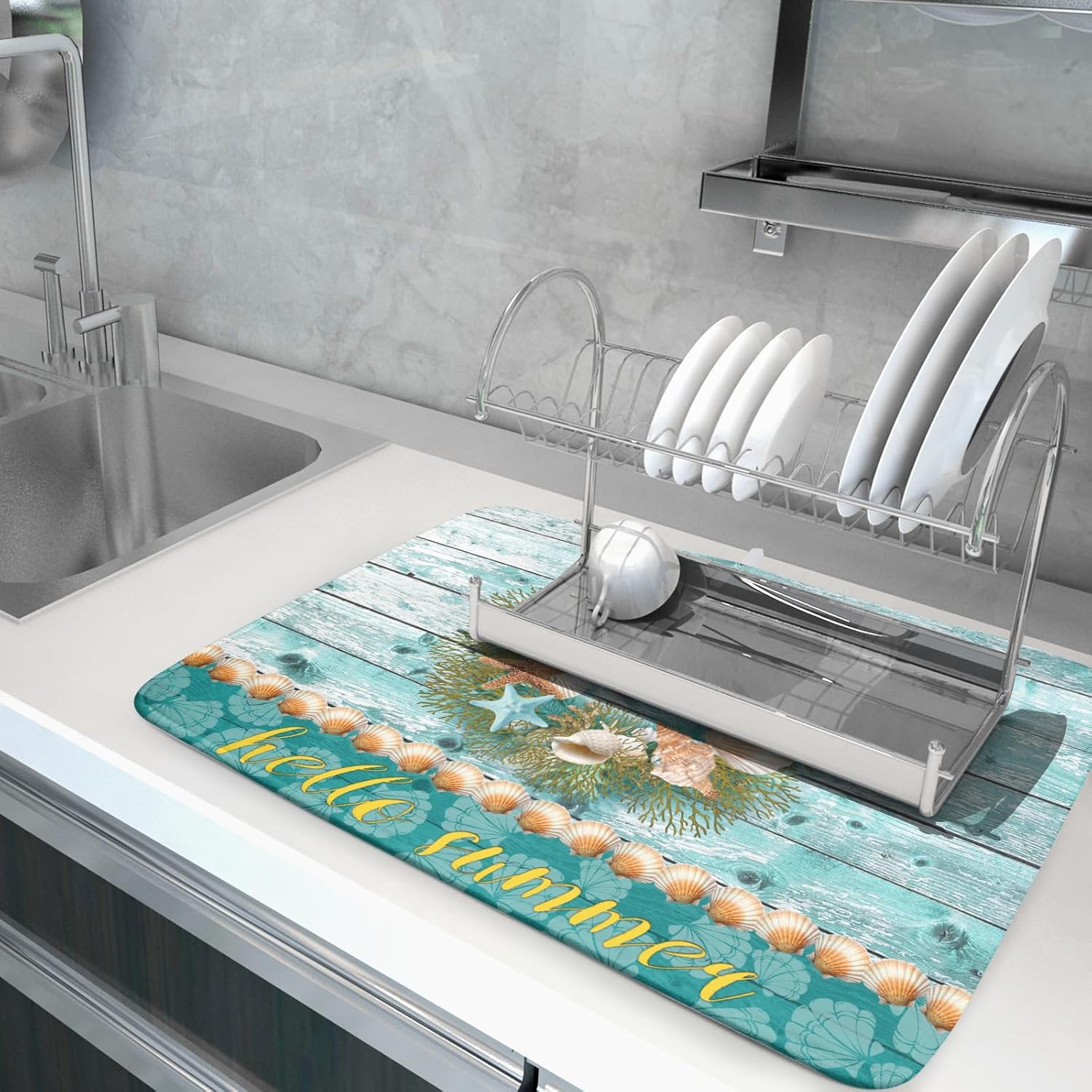 Coastal Wreath Dish Drying Mat 18x24 inch Starfish Shell Absorbent Microfiber Dish Rack Mats Drainer Pad Kitchen Countertop Accessories