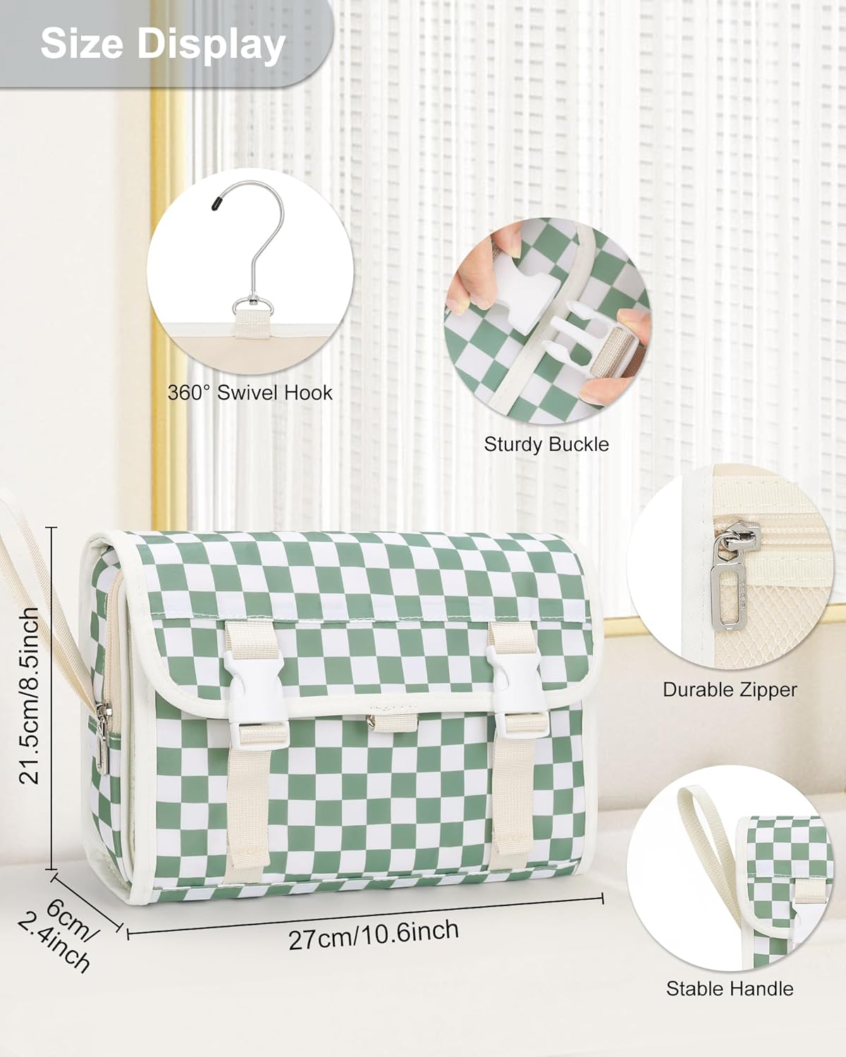 Relavel Travel Hanging Toiletry Bag for Women, Large Capacity Wash Bag with 360 degree Rotation Hanging Hook, Portable Toiletries Makeup Organizer Storage for Daily Use, Trip, Camping - Green Plaid