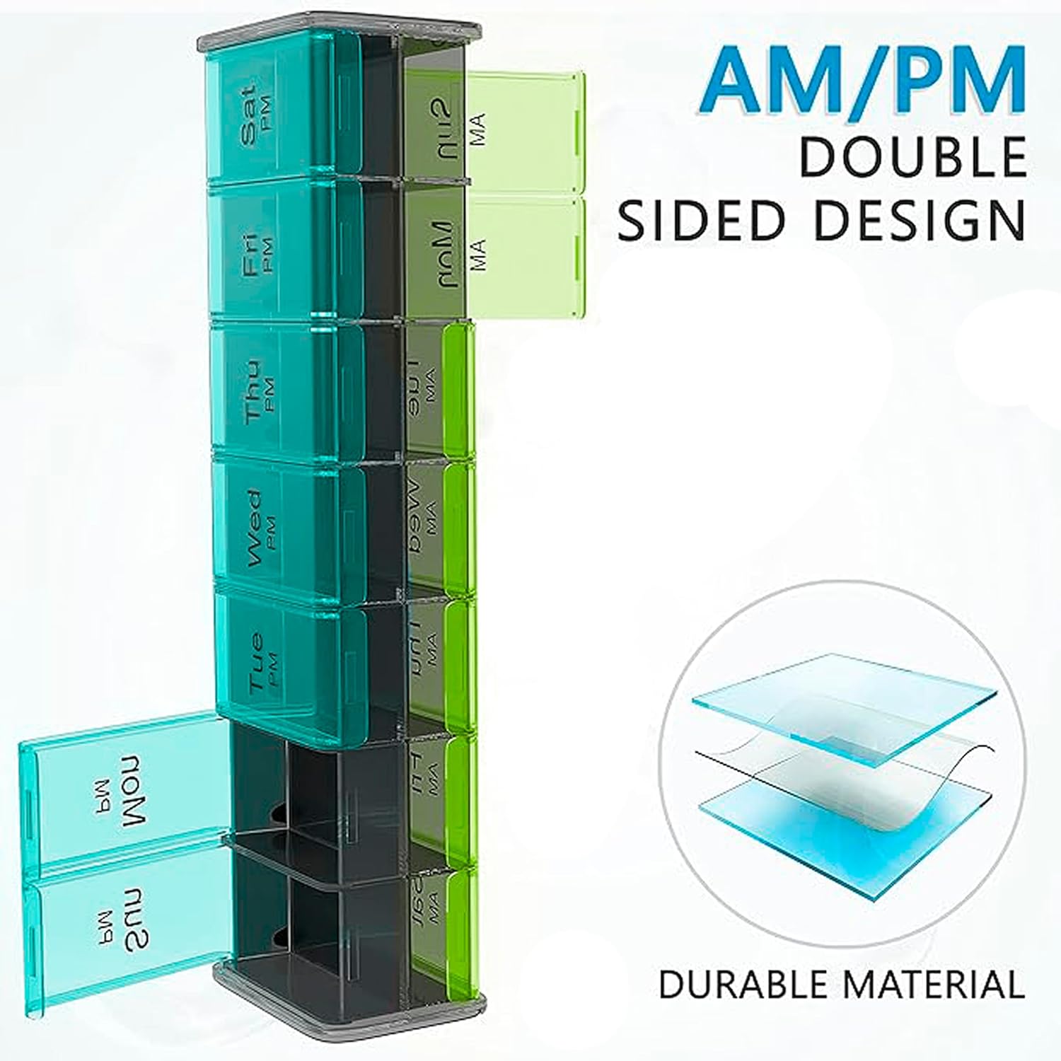- Dual-Color Design – This weekly medicine pill organizer 2 times a day features a practical green and blue color split, simplifying pill organization. Large, clear labels on each compartment ensure effortless medication management throughout the week