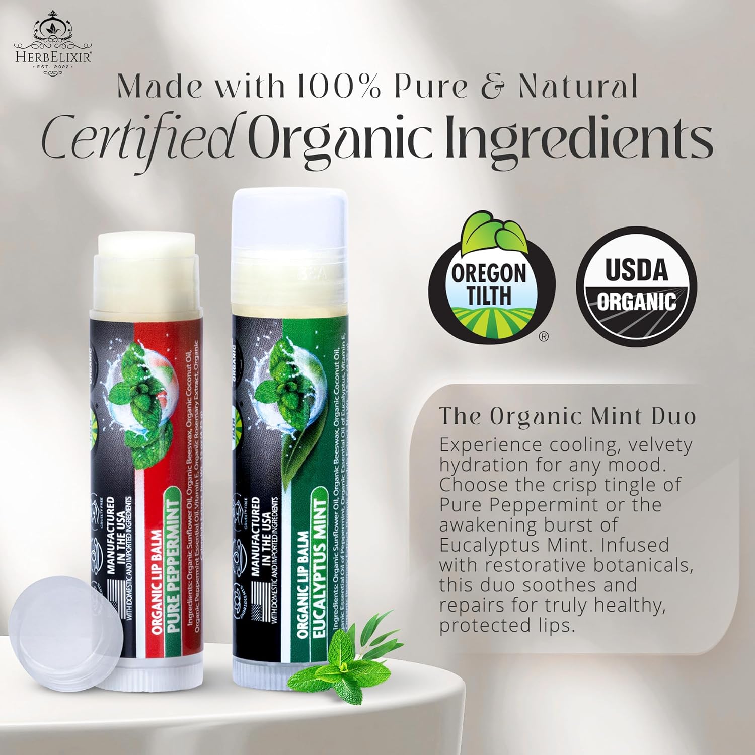 Organic Lip Balm Variety Pack | 4 Pack Peppermint & Eucalyptus Mint Chapstick Set | Moisturizing for Dry Lips | For Men and Women