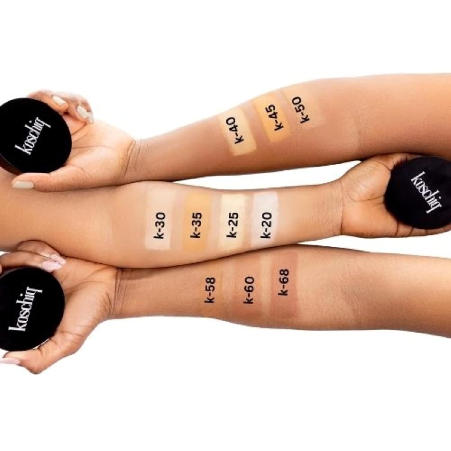 - KOSCHIQ COSMETICS: provides you with a soft matte powder plus foundation that can be used as a foundation and also on top of a foundation , leaving the skin younger and fresher all day, everyday