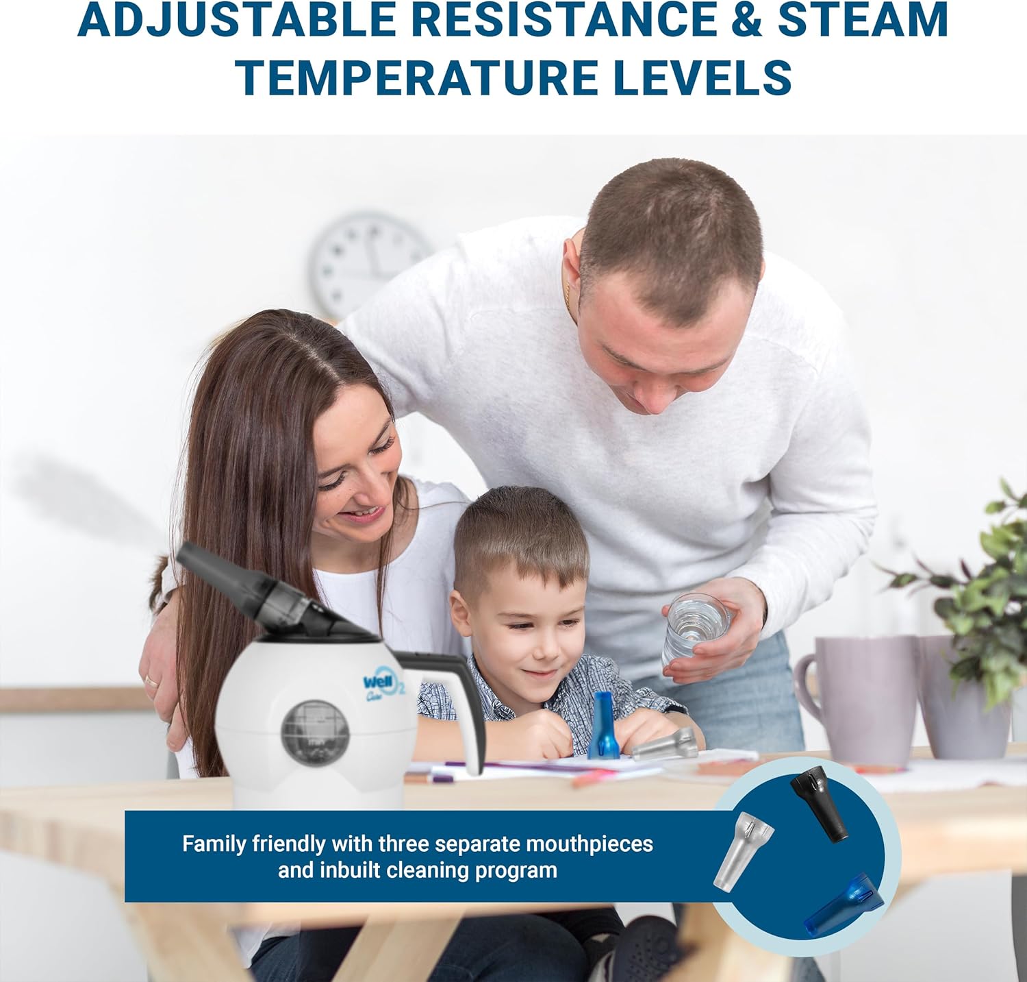 - FULLY CUSTOMIZABLE: Adjustable resistance and steam temperature levels, make it an ideal breathing aid for anyone seeking to improve their respiratory strength and wellness; family friendly with three separate mouthpieces and inbuilt cleaning program