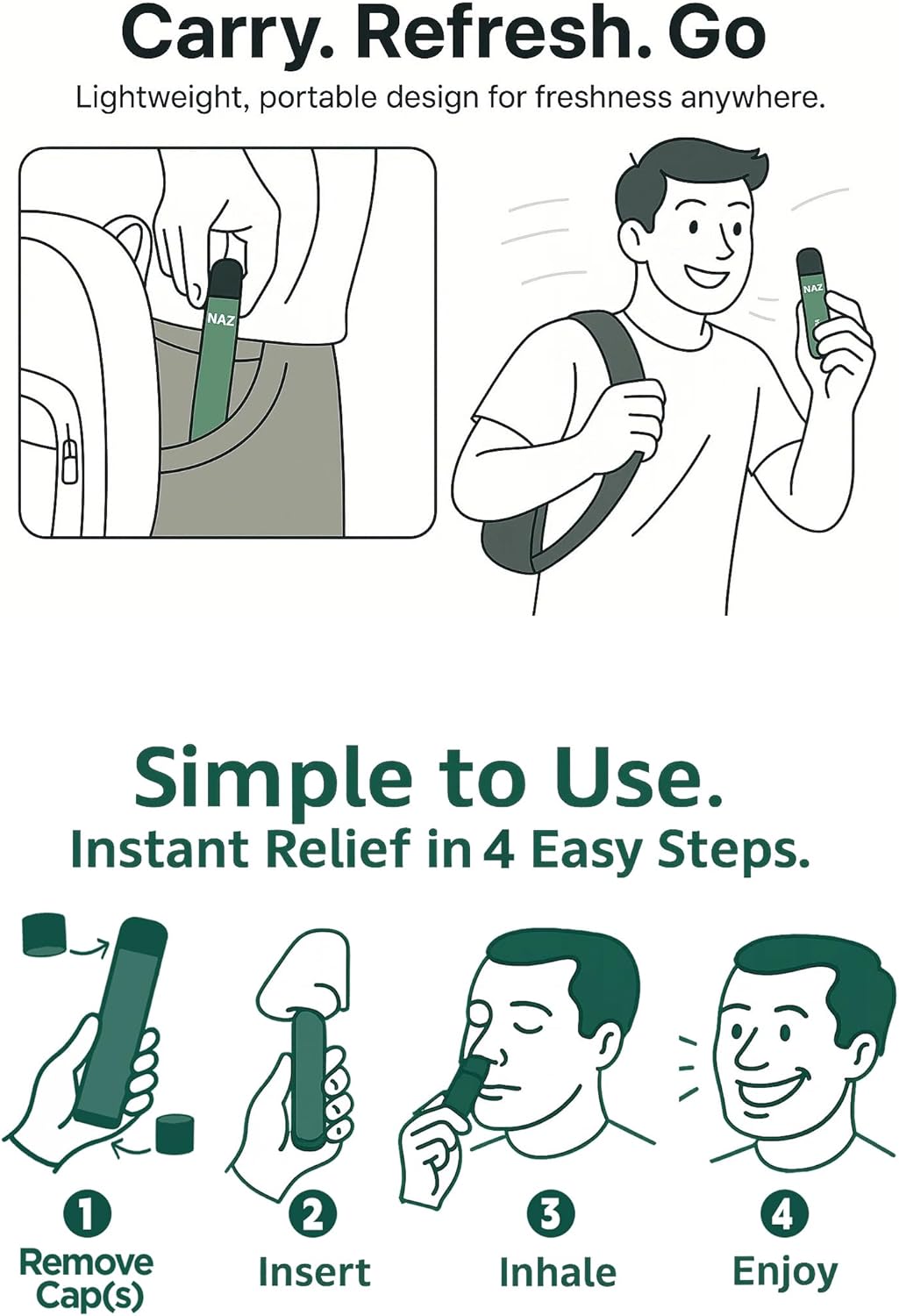 - 💨 [Portable & Easy To Use] NAZ nose inhaler stick is small and light, fitting effortlessly into your pocket or bag—perfect for on-the-go use anytime you need a refresh. Simply insert the vapor inhaler nasal stick into your nostril and inhale to experience the cool, refreshing menthol scent and mist through your nostrils, bringing a soothing sensation