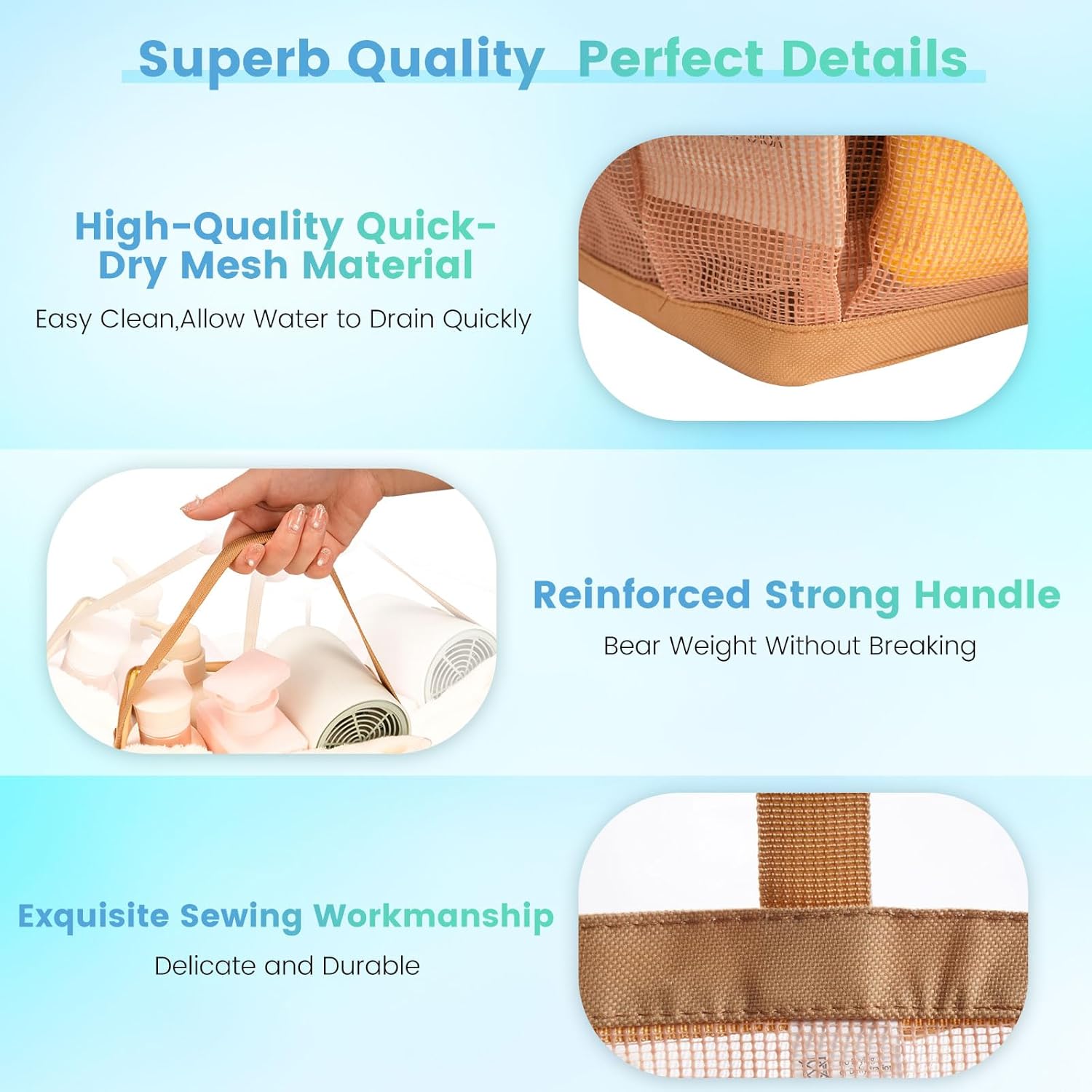- Selected Mesh, Superior DurabilityďźCrafted from quality mesh fabric, this portable shower caddy is built for daily use and long-lasting durability. It holds heavy items without tearing, and reinforced handles make it easy to hang, keeping your essentials within reach all the time.