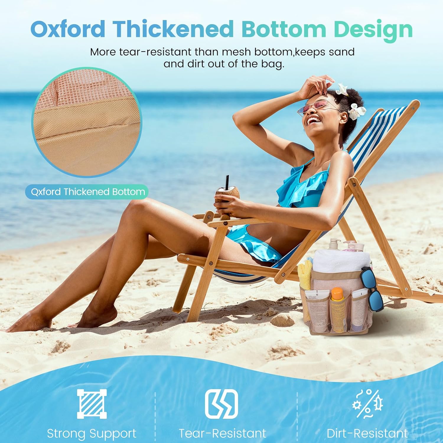 - Reinforced Base, Stronger SupportďźFor the most essential part of this beach bag, we utilize highly strong and durable Oxford fabric for the bag base, delivering higher weight capacity, wear and tear resistance. The base supports travel essentials firmly and keeps them away from sand.