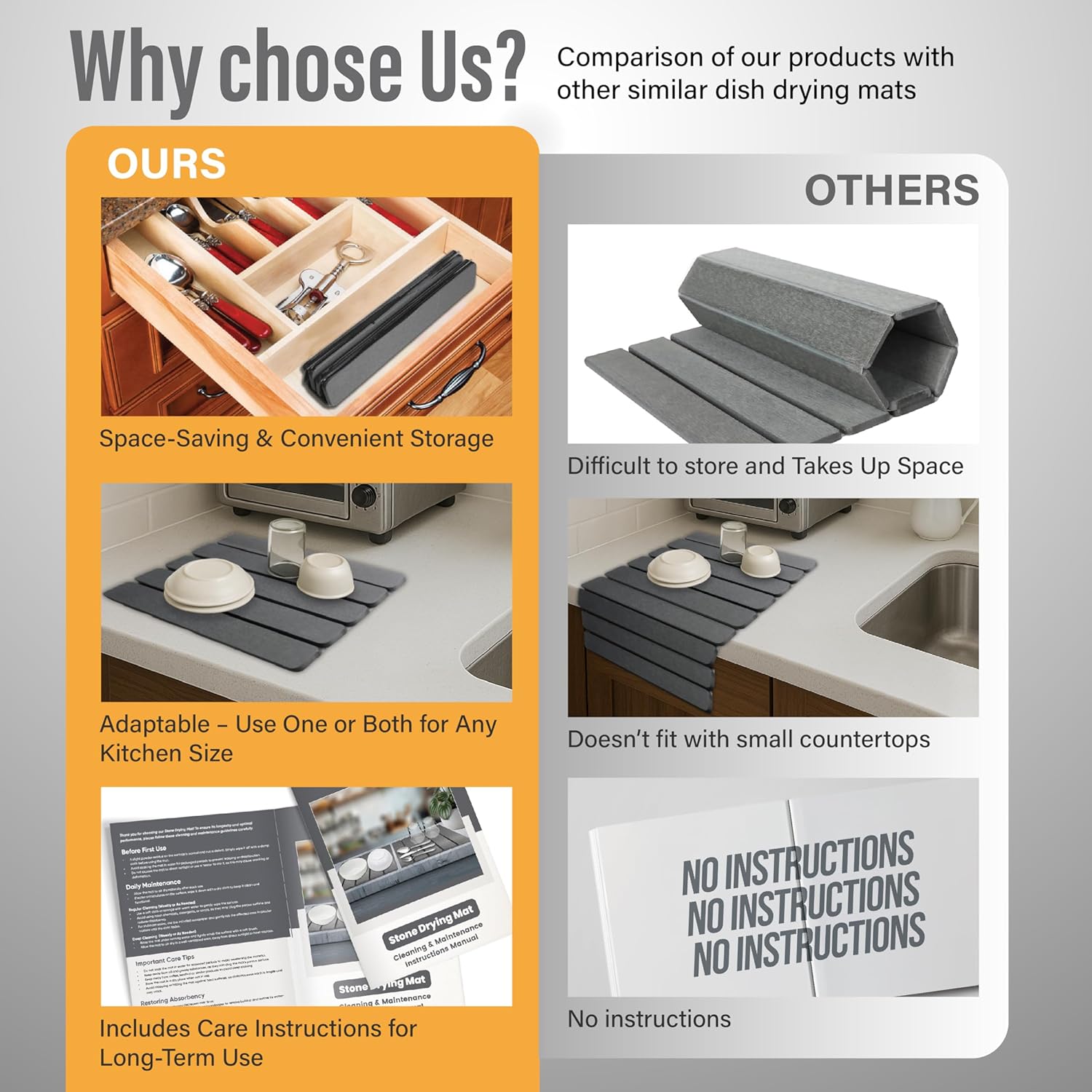 - Durable & Stable on All Counters: Built with five durable stone tiles bonded to a flexible backing, this drying mat for kitchen counter stays stable thanks to the included non-slip pad. It’s sturdy enough to hold dish racks, glassware, or pots. Fits beautifully on any surface—quartz, granite, wood—and adds a premium touch to your kitchen or bath.