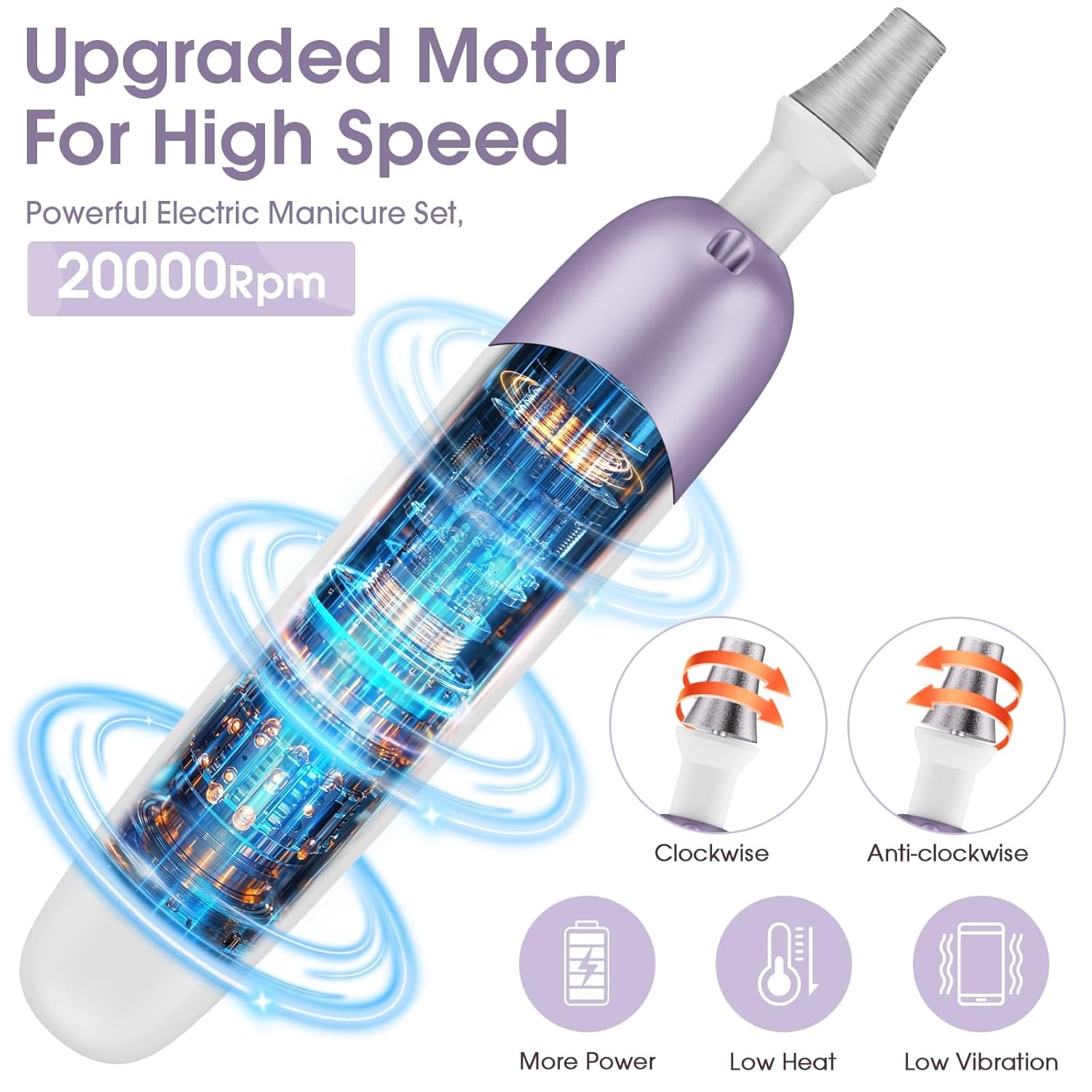 - Professional Manicure and Pedicure Set: This electric nail file is design for hand and foot care, can be used for all-around shaping, buffing, grinding, polishing, cuticle, hard skin, callus removing. perfect manicure kit for women trimming, grinding and polishing natural nails and toe nail grinder kit for thick nails. You will enjoy this manicure pedicure tool kits !!!
