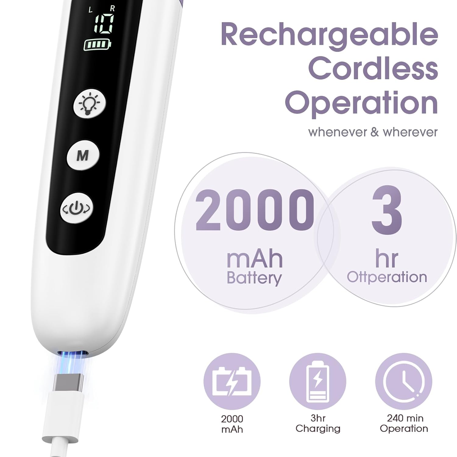 - Cordless, Rechargeable, LCD Display: Type C USB Cable included, this electric manicure pedicure kit can be up to 6 hours of Runtime on a single charge, LCD Display help remind you the rest power it left and the Speed level you used. Professional electric nail file for home salon use, or travel , you can do a spa hand and foot care experience at anytime anywhere you want.