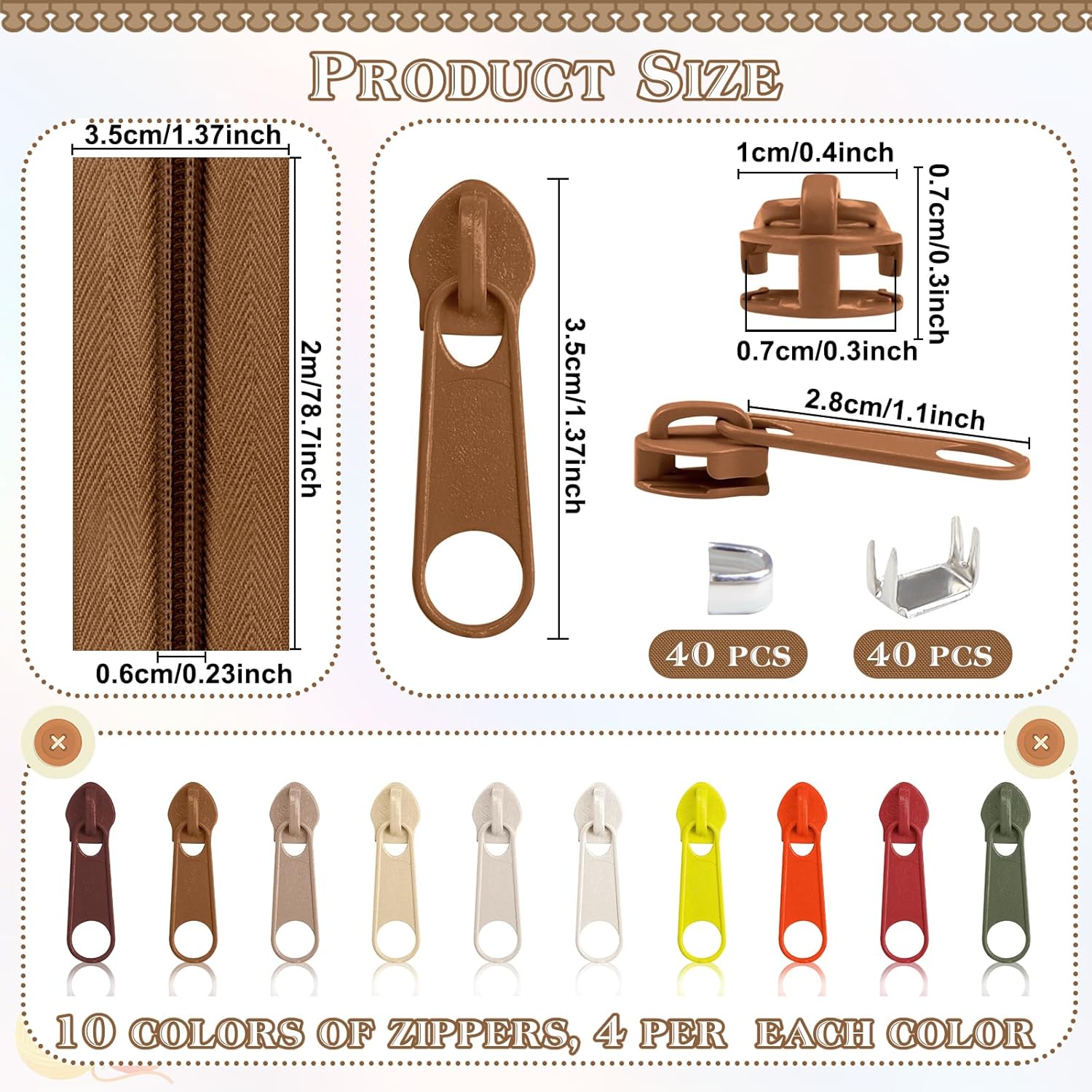- Package includes: you will get 22.2 yards/ 20 m nylon coil zipper rolls in 10 colors, show in the picture, 2.22 yards for each color, and 40 pieces assorted colors zipper sliders, you can cut it to the right size, suitable for DIY sewing crafts.