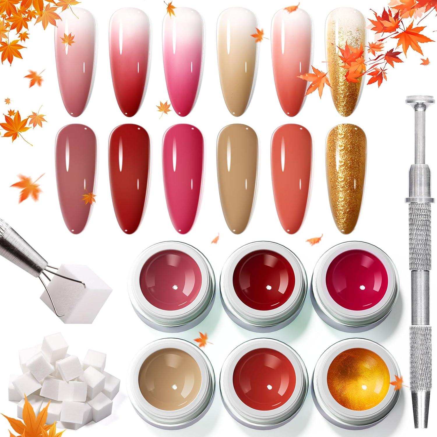 - 【Ombre Painting Gel Kit for Caramel Cream Style Nails】This gradient painting gel set includes 6 richly pigmented shades plus pro tools: 30 ultra-soft, low-absorption sponges and a metal-grip dotting pen. Perfect for salon-worthy ombré, blush effects, or artistic designs, it’s a one-stop solution for blending, detailing, and color layering.