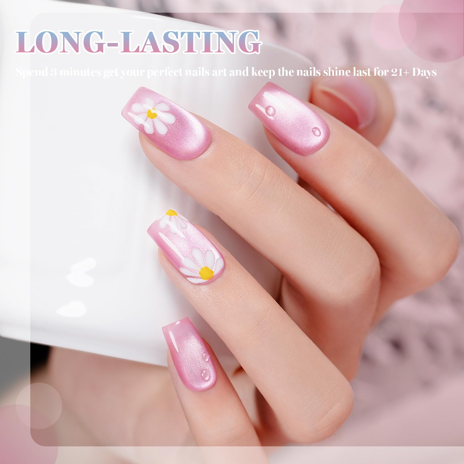 - EASY TO USE:This bubble pink cat eye gel polish is made with with natural resin ingredients,magnetic shimmers,and a resin formula,so this gel polish set won't cause smudges cracks, or chips.It can last for 21 days with perfect shine under proper application