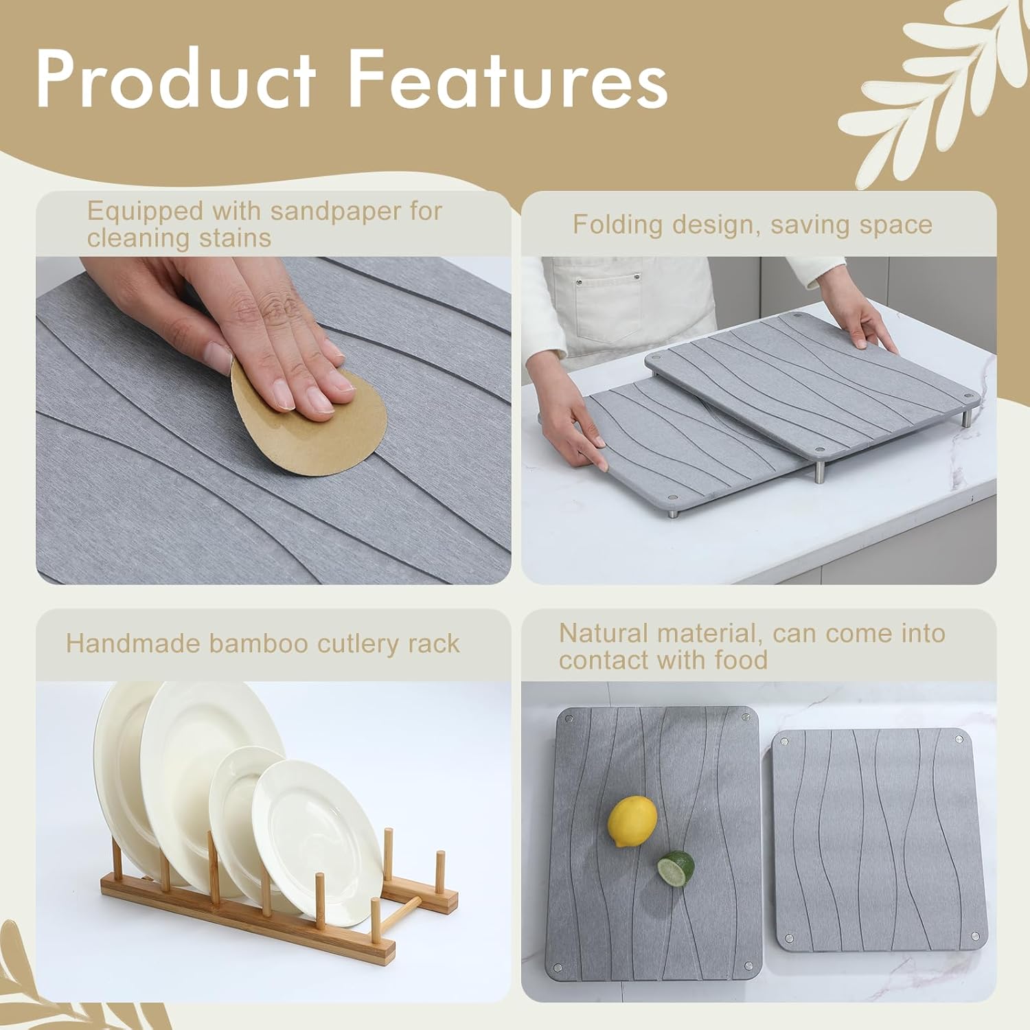 2 PCS Nesting Stone Drying Mat for Kitchen Counter,Equipped Dish Rack,Tableware Drying Mat Set,Diatomaceous Earth Material,Suitable for Plates,Cups and Any Kitchen Utensils (Grey)