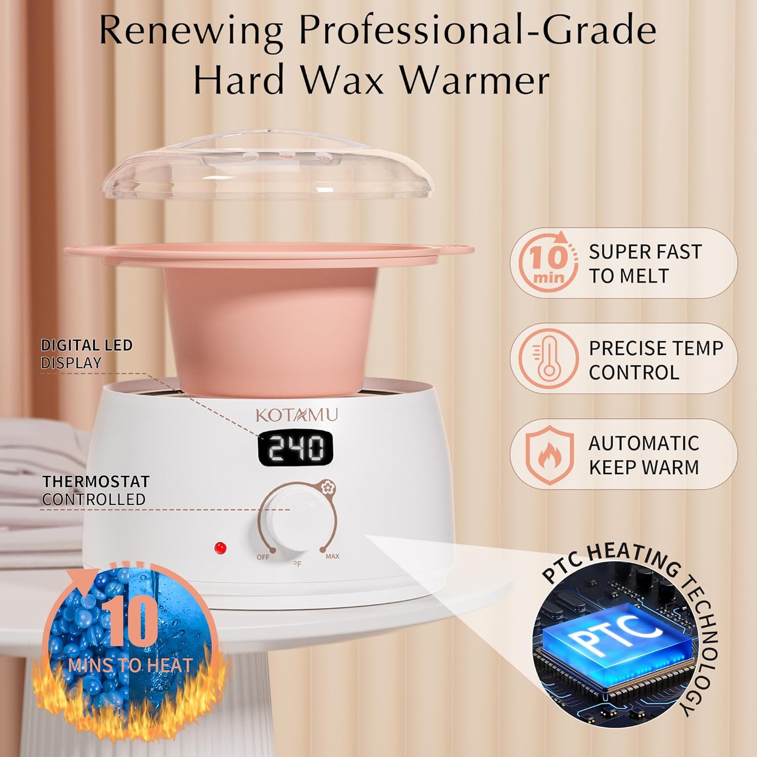 - Fast Heat Up & Precise Temp Controlďź Wave goodbye to wasted time! Our KOTAMU hard wax kit for hair removal introduces a digital wax machine that melts waxing beads in just 10-15 minutes. Ideal for busy lifestyles, this body wax kit keeps a steady temperature for a quick, safe, and smooth waxing session. Skip the salon queues and enjoy the speed and convenience of professional at-home hair removal!