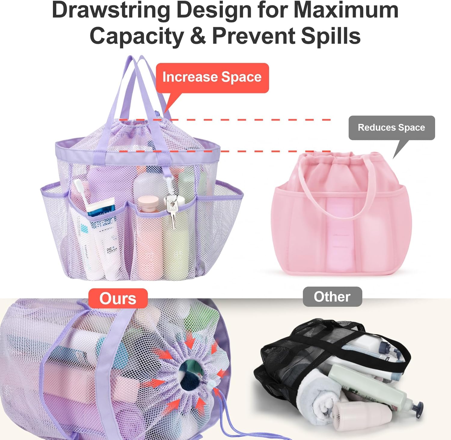 - 7 Upgraded Deep Pockets & Secure Drawstring for Peace of Mind: This shower tote bag features 7 upgraded exterior pockets with 7-inch depth, keeping tall bottles upright to prevent spills. A secure drawstring closure ensures toiletries stay safely insideâno more spills or lost items while youâre on the move