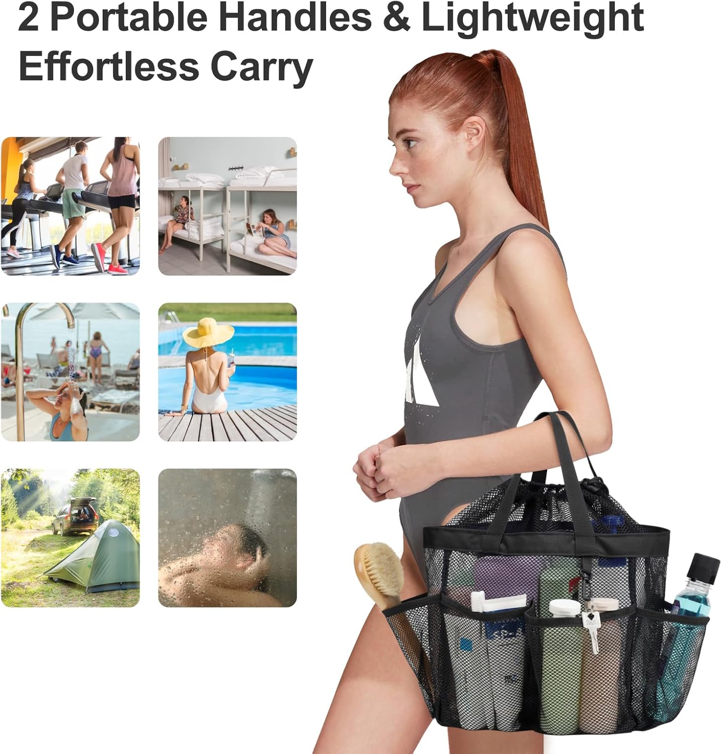 - 7 Upgraded Deep Pockets & Secure Drawstring for Peace of Mind: This shower tote bag features 7 upgraded exterior pockets with 7-inch depth, keeping tall bottles upright to prevent spills. A secure drawstring closure ensures toiletries stay safely insideâno more spills or lost items while youâre on the move