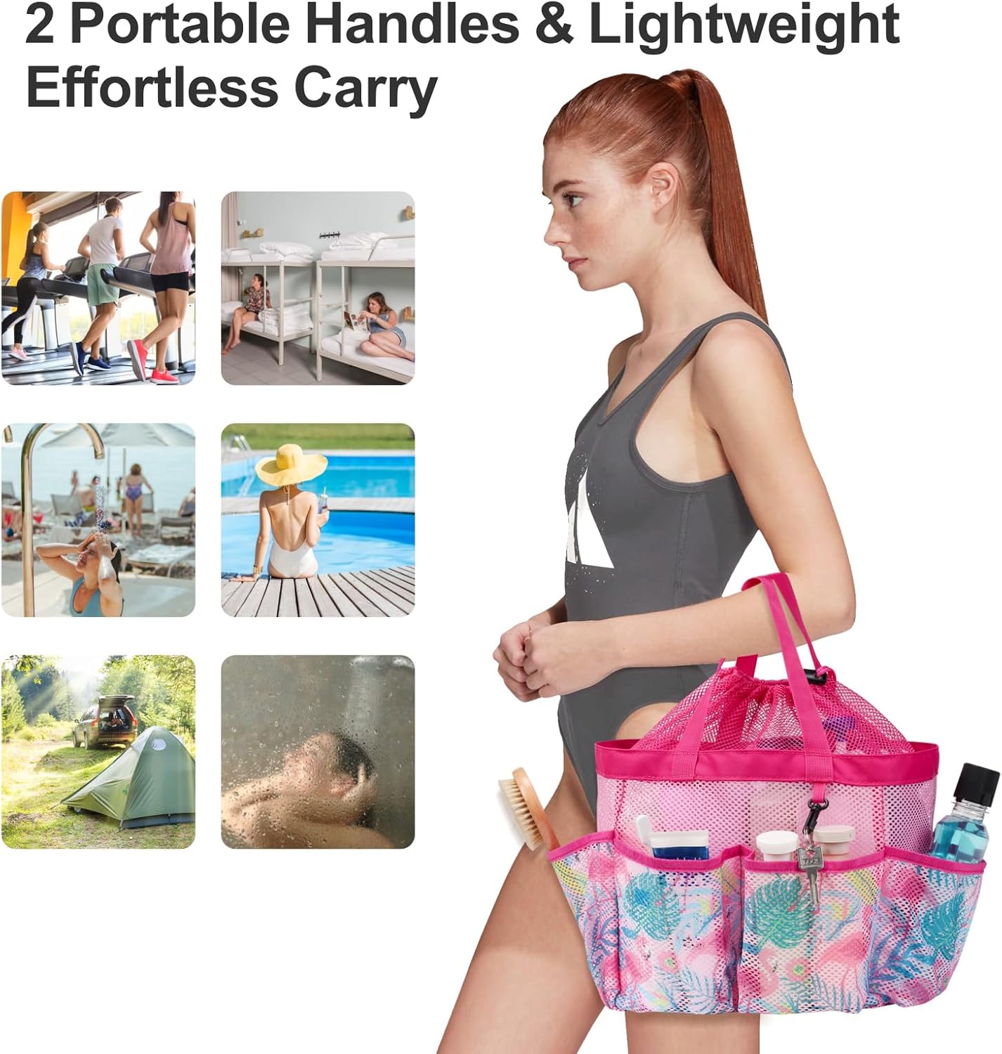 F-color Mesh Shower Caddy Portable with Drawstring - Upgrade Deeper 7 Pockets Dorm Room Essentials for Guys Girls with S Hook, Shower Bag Basket Tote for College Camping Bathroom, Pink Flamingo