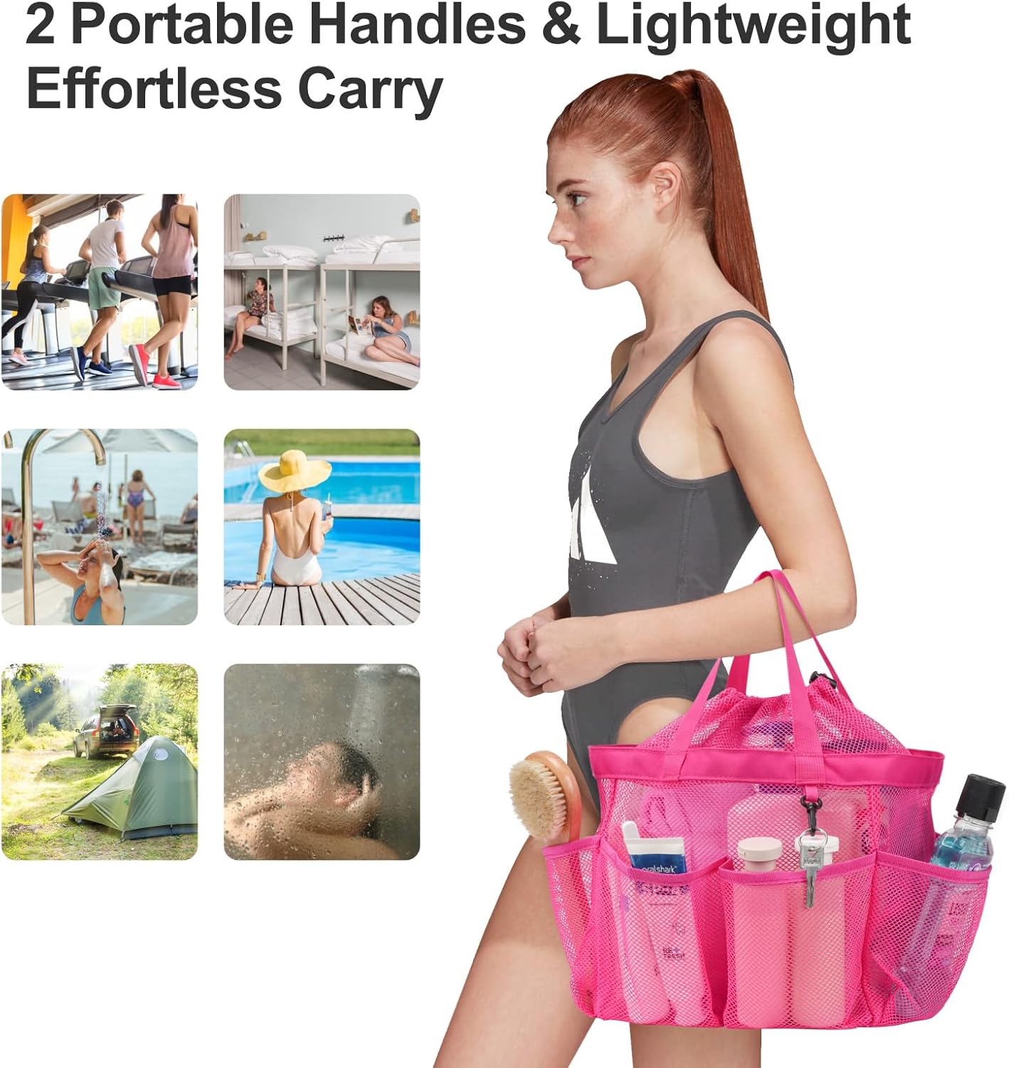 - 7 Upgraded Deep Pockets & Secure Drawstring for Peace of Mind: This shower tote bag features 7 upgraded exterior pockets with 7-inch depth, keeping tall bottles upright to prevent spills. A secure drawstring closure ensures toiletries stay safely insideâno more spills or lost items while youâre on the move