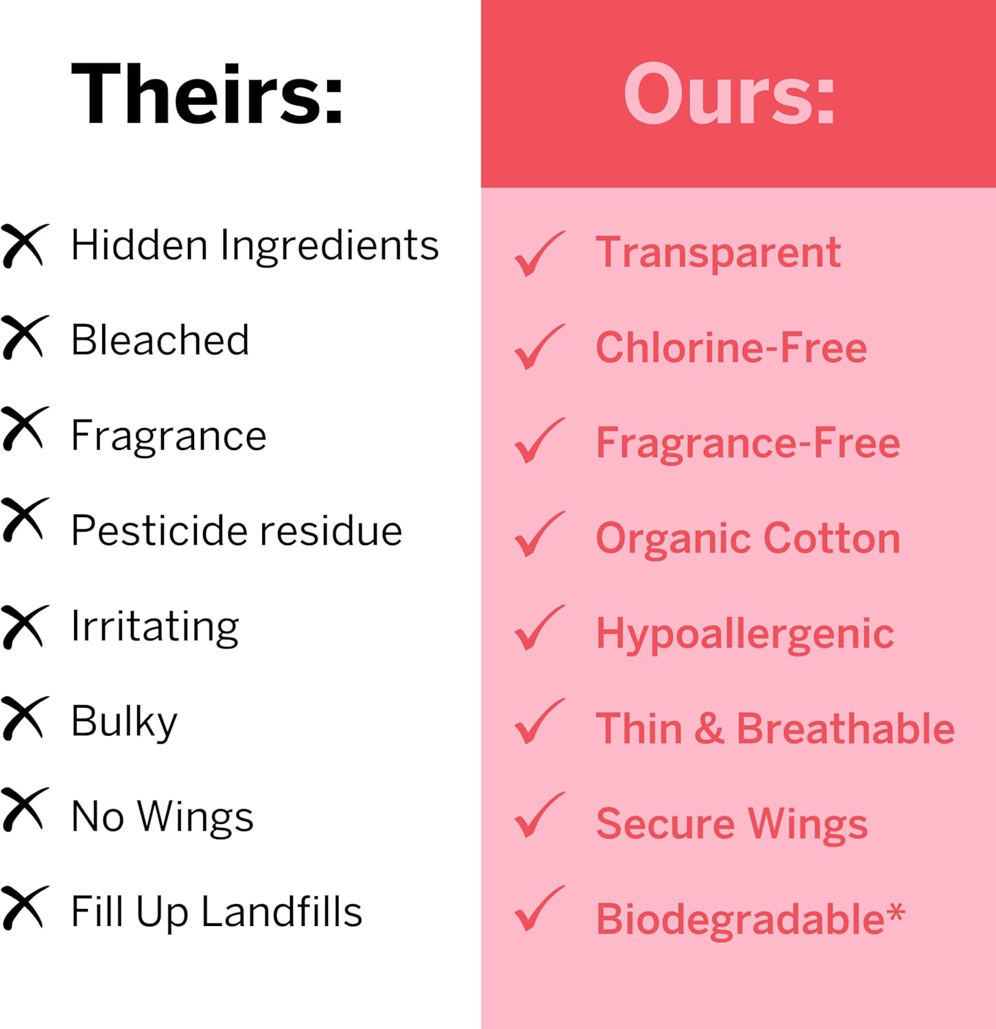 - IRRITATION-FREE. Our pads are hypoallergenic and moisture-wicking, locking away fluid and odors to leave your intimate skin happy and healthy.