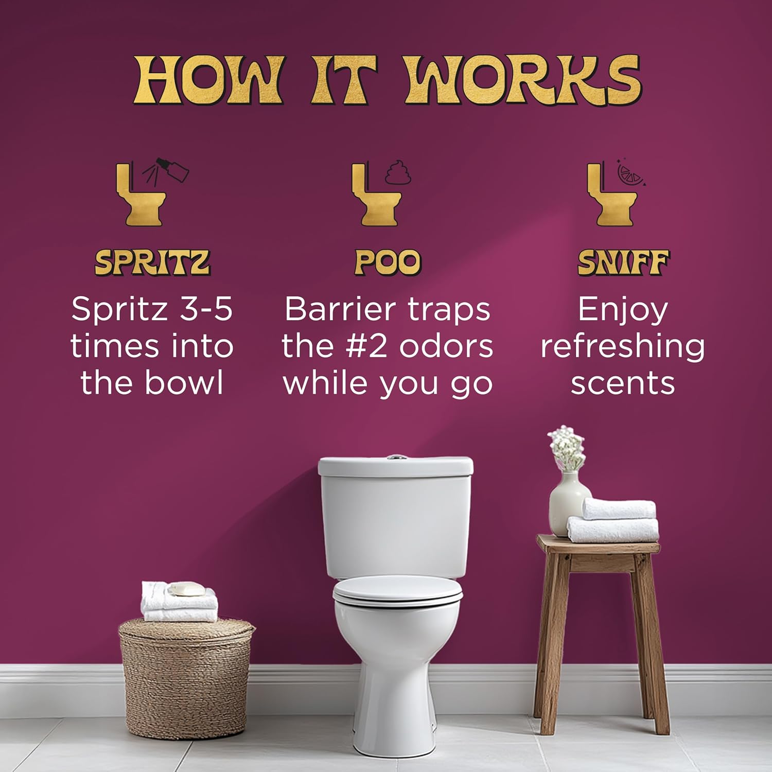 - Stops Odors Before They Begin – Unlike other air fresheners that just mix with the stink, Poo-Pourri removes bathroom odors at the source. Just spritz 3-5 sprays into the toilet bowl before you go, and trap odors below the surface.