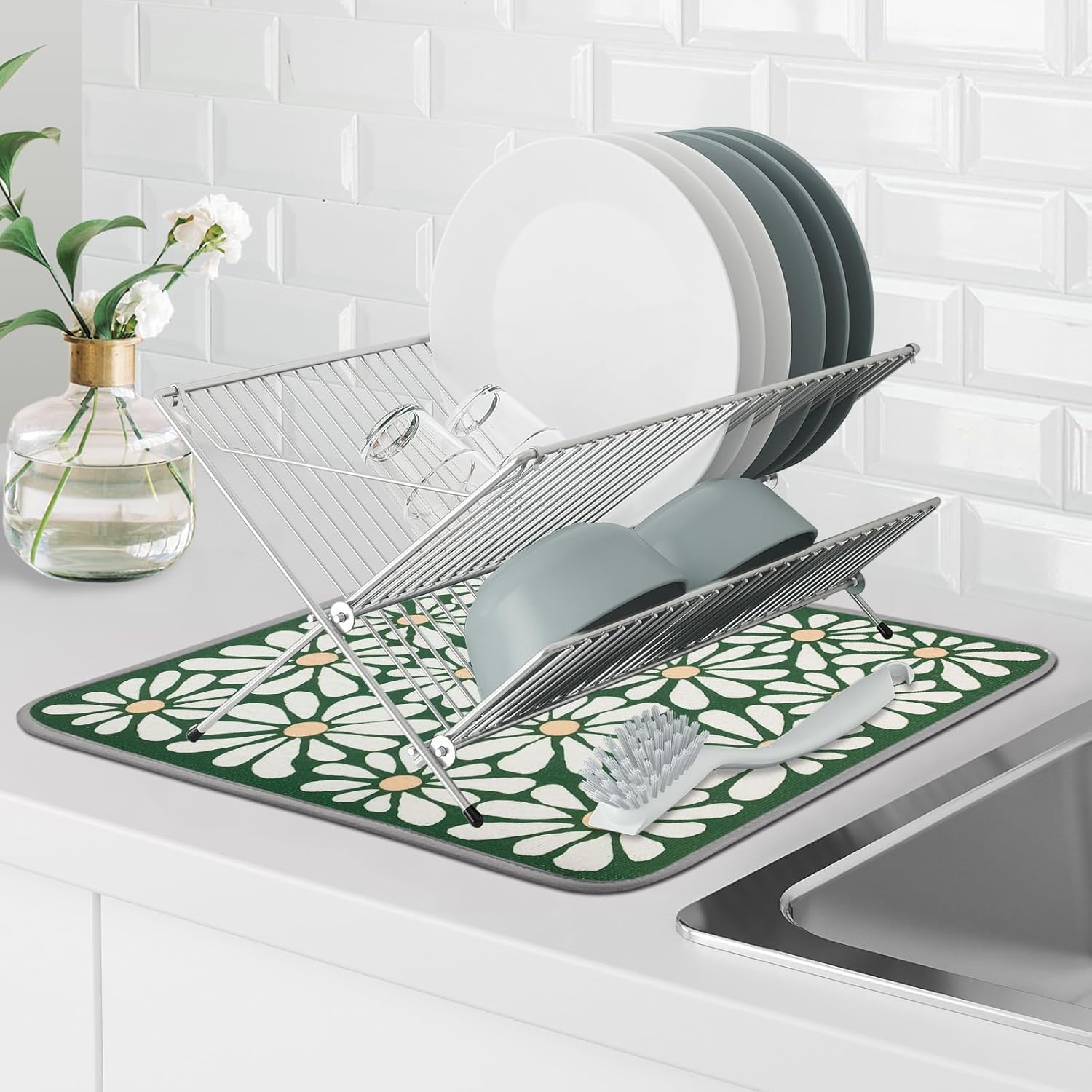 SHIYUE Dish Drying Mat for Kitchen Counter Super Absorbent Spring Kitchen Decor Microfiber Drying Matainers Rack Fast Pad Dish Drainer Mats(Green Flower,16''x18'')