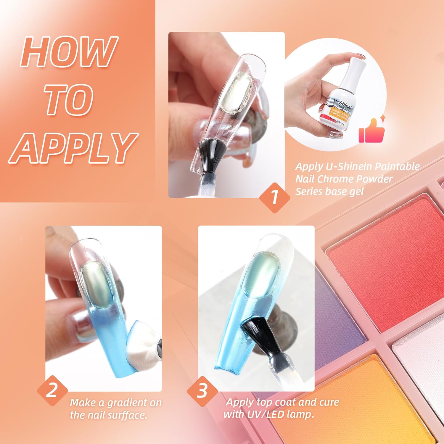 - Nail Art Pigment Powderļ¼Enhance your nail art creations with U-Shinein Nail Art Pigment Powder. This set contains a range of highly pigmented powders that will bring vibrant colors and stunning effects to your nails.