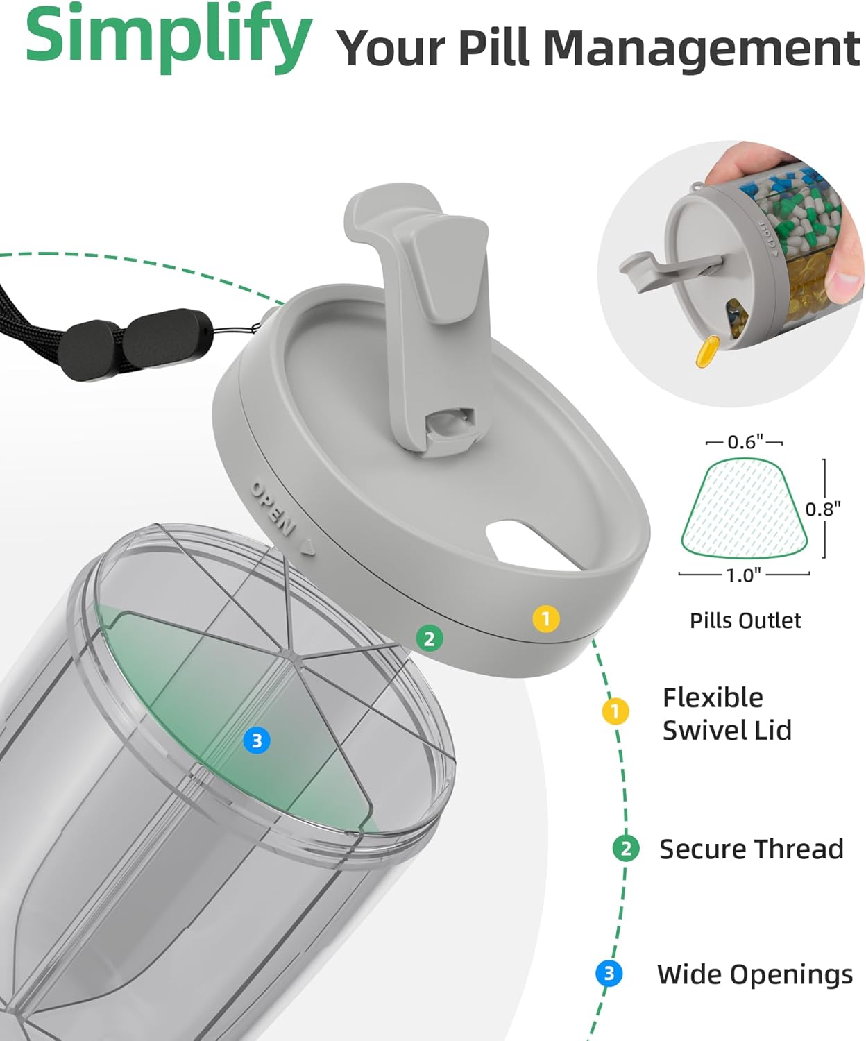 - Easy to Retrieve: The smooth-loosing thread and lid can swivel flexibly, and the wide openings are friendly for taking pills. With the above 3 thoughtful and unique designs, the large pill organizer makes filling and taking medication effortlessly