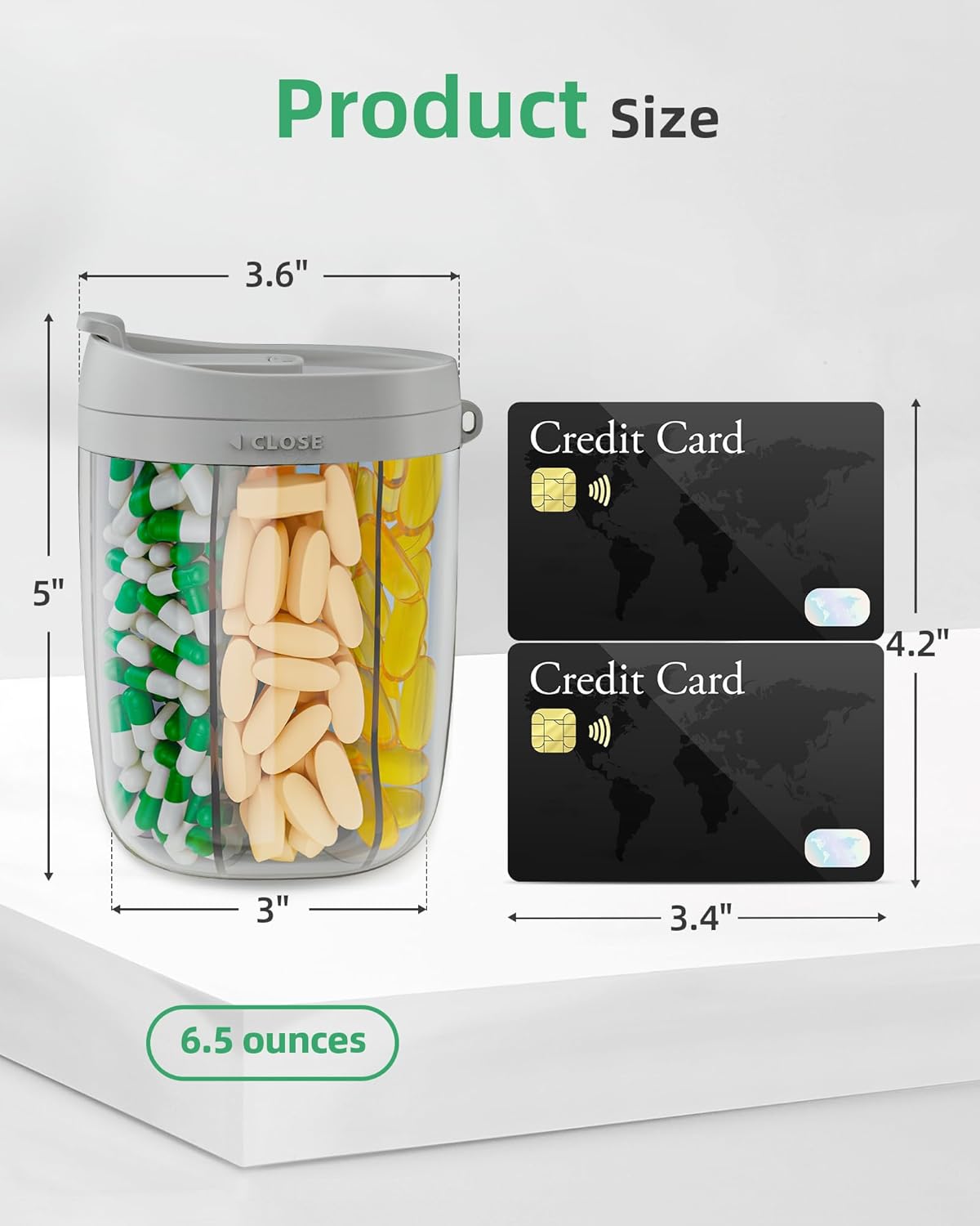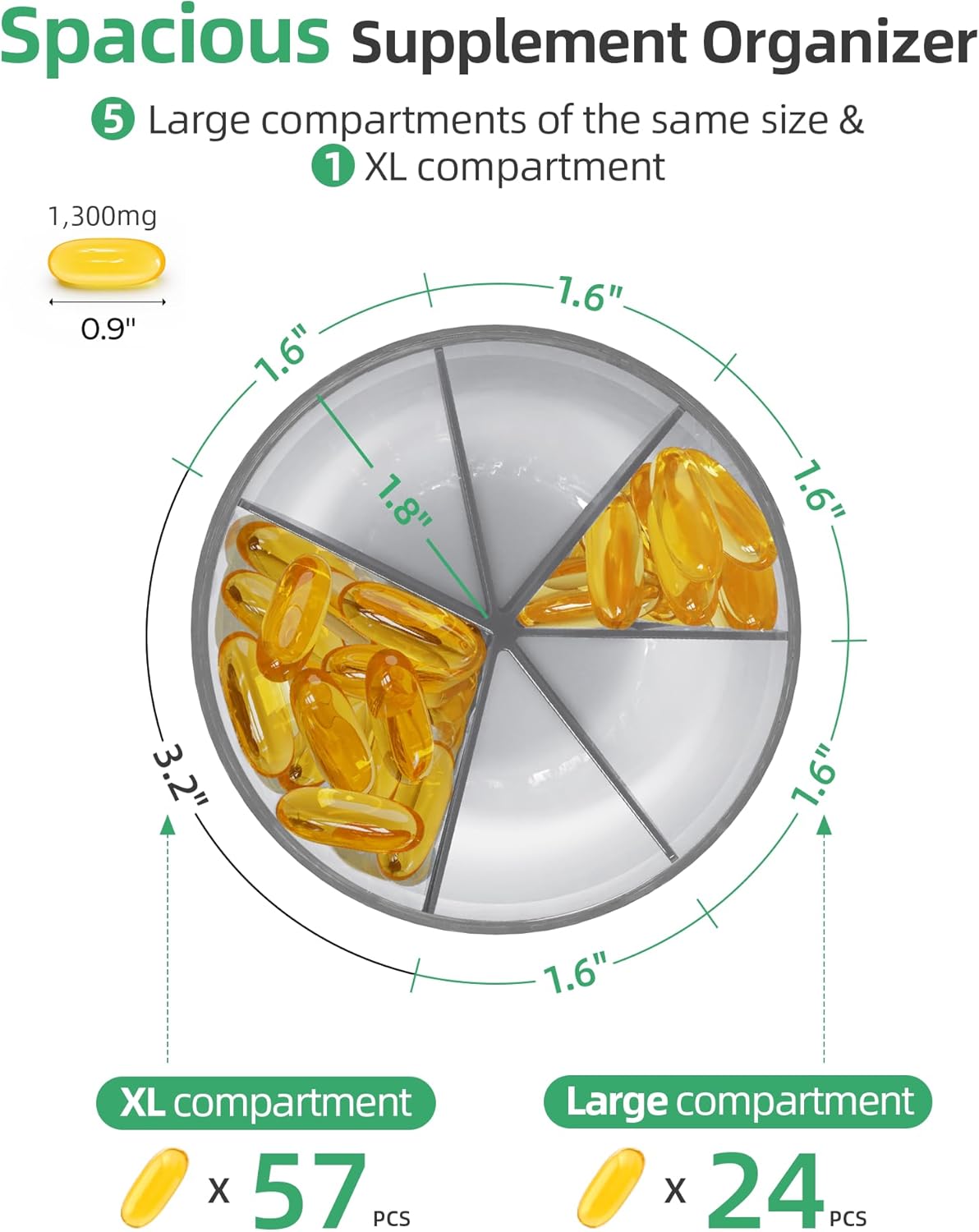 - Large Compartments: The PULIV pill holder weighs 6.5 ounces and features 1 XL compartment and 5 large compartments. The XL compartment can hold up to 57 fish oils, with each fish oil measuring 0.9" in length, while each of the large compartments can store 24 fish oils. This pill dispenser offers a convenient way to store 6 types of pills in one place. It has a height of 5.0" with a lid diameter of 3.6" and a base diameter of 3.0". And 20 stick-on labels can help differentiate each compartment