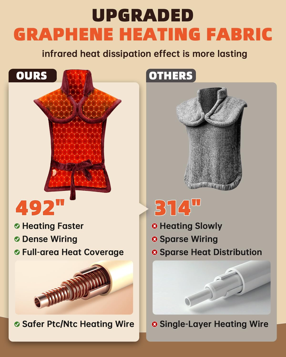 - Graphene-Infused Heating for 4X Deeper Muscle Relaxation- Featuring graphene technology, Heat penetrates deeper! this heating pad releases infrared heat that deeply penetrates skin and muscle tissue, Distribute evenly over the skin promoting better blood circulation. Unlike traditional heating pads that only warm the surface, graphene technology targets sore muscles at a deeper level for more effective, long-lasting relief.