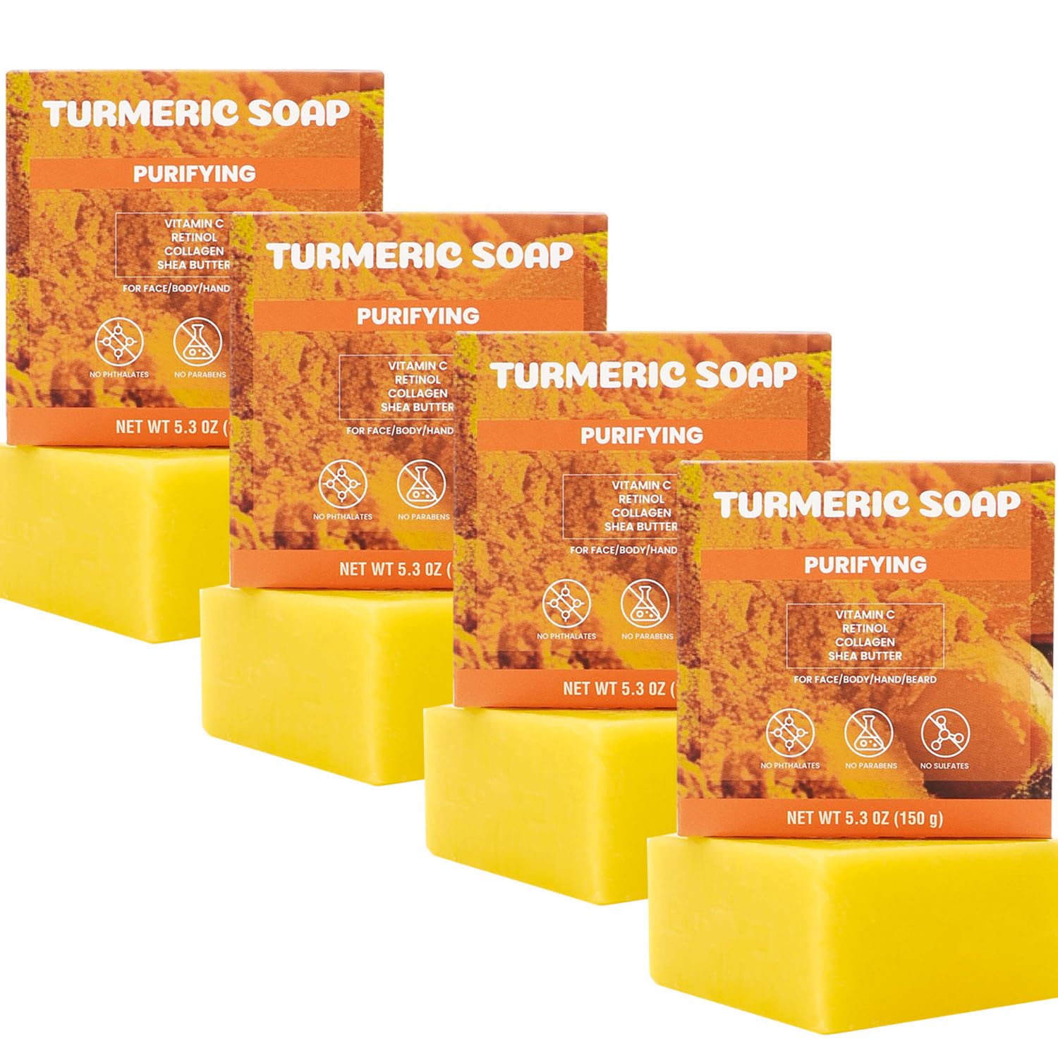 - NATURAL INGREDIENTS SOAP: Our turmeric face and body soap features natural ingredients like retinol, turmeric, deeply nourishes your skin, leaving your skin looking vibrant and refreshed
