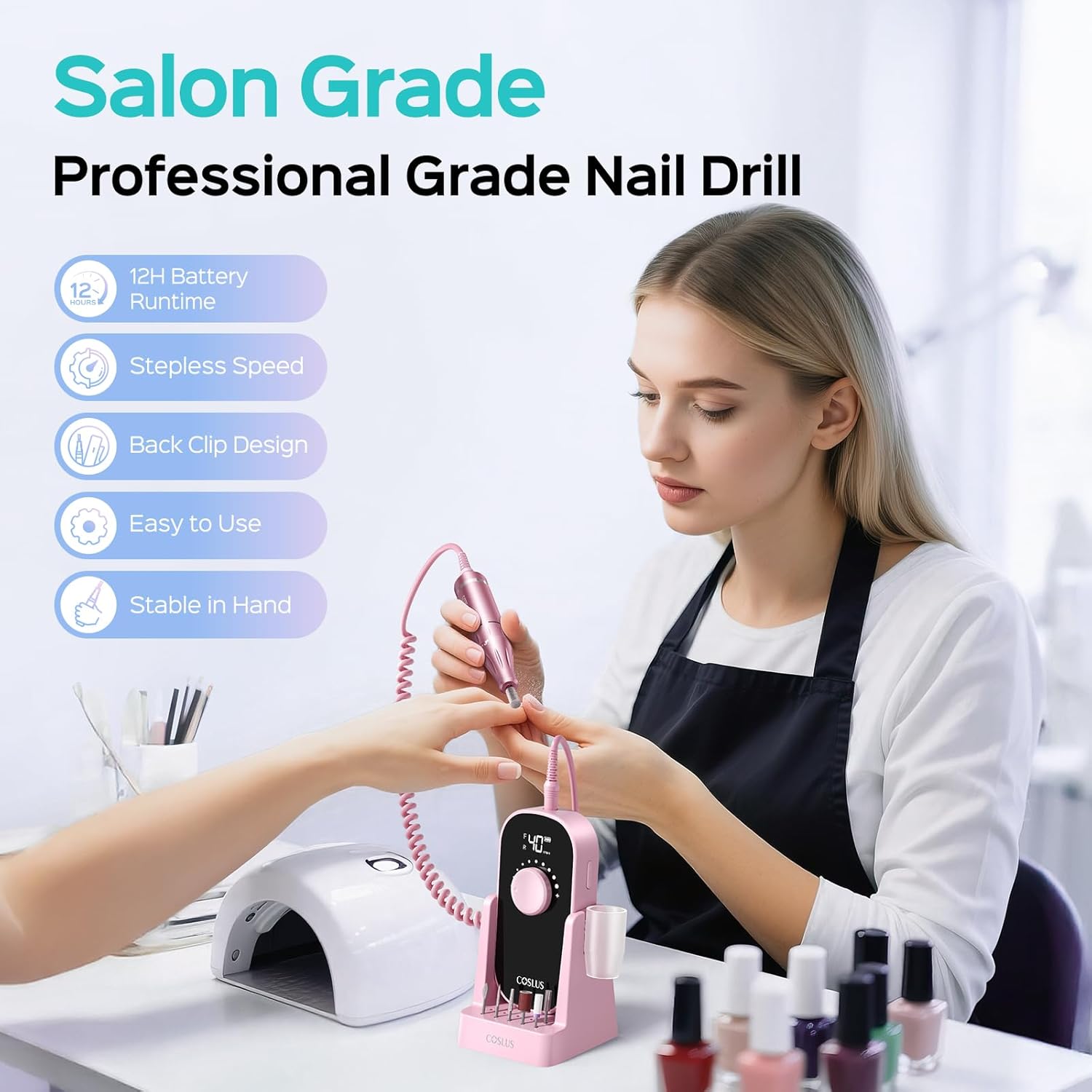 COSLUS Professional Rechargeable Electric Nail Drill 40000 RPM, Portable Nail File with Storage Stand for Acrylic Gel Polishing Removing - Easy to Use for Women, Manicure at Home DIY or Salon, Pink
