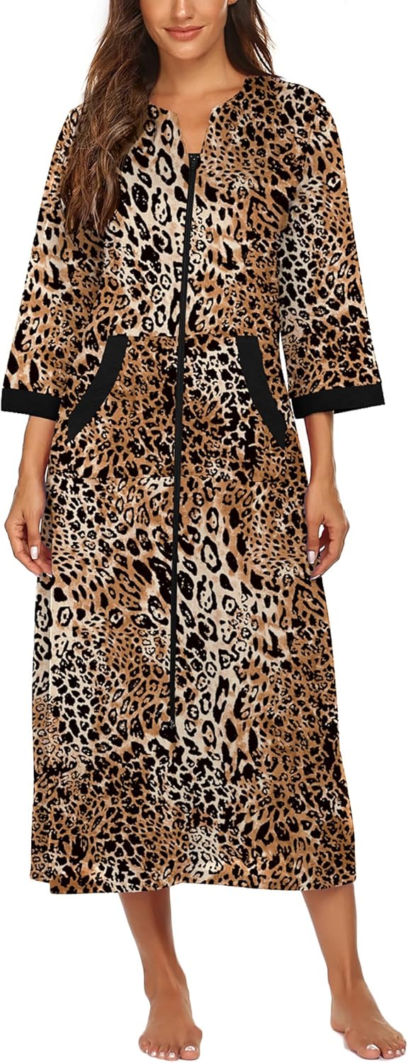Ekouaer Women Zipper Robe 3/4 Sleeves Loungewear Dress Full Length Sleepwear Pockets Housecoat Nightgown Long Bathrobe