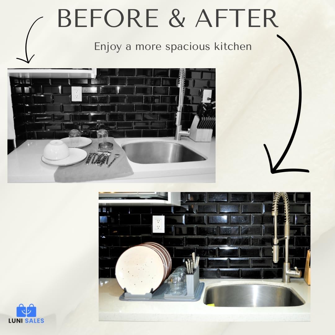 - PERFECT FIT FOR ANY SPACE â Whether your space is big or small, our kitchen drying mats for countertops are spacious, easy to fold, and store in seconds. The kitchen dish drying mat that adapts to your needs.