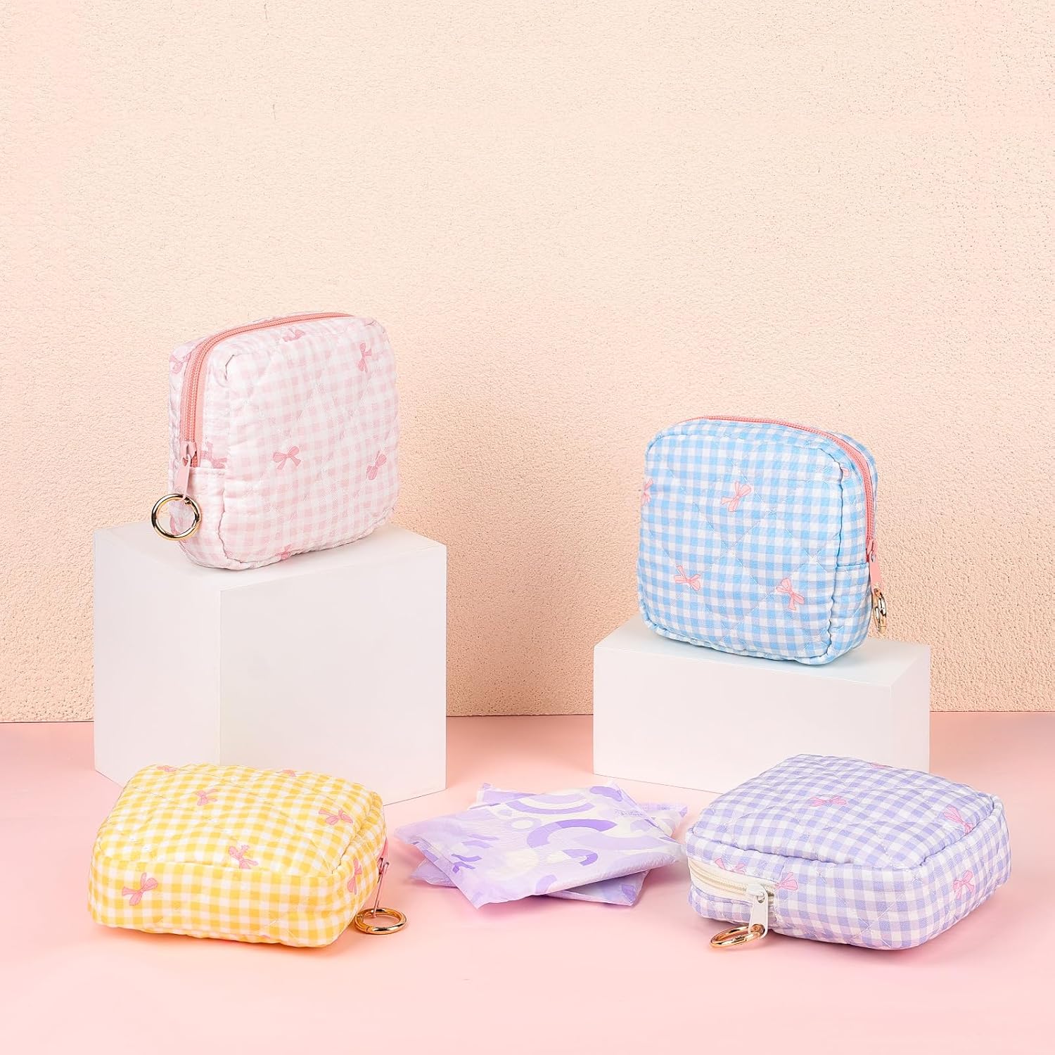 Period Bag for Teen Girls, Quilted Sanitary Napkin Storage Bag, Cute Bow Tie Menstrual Pad Pouch Tampon Holder (Plaid Pink)