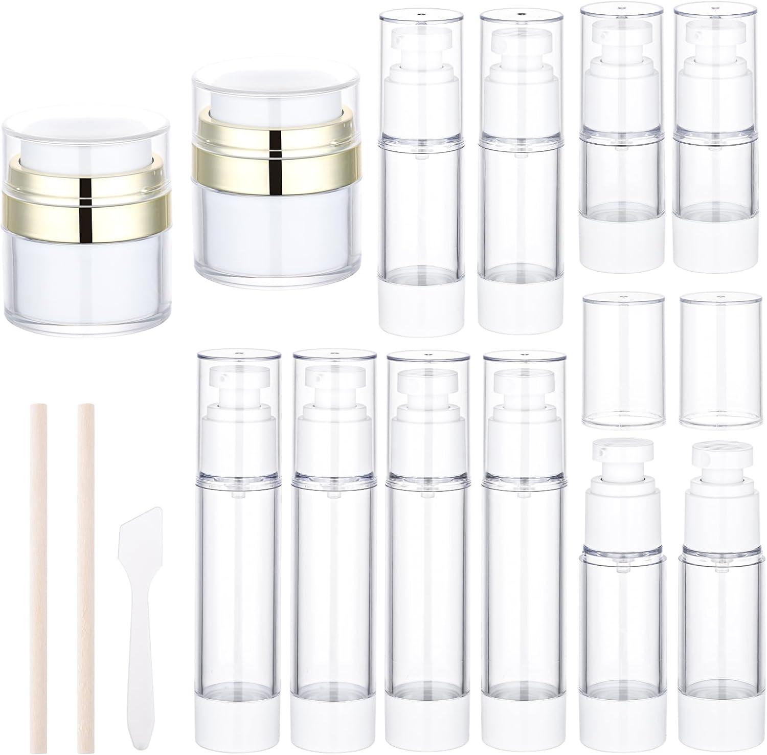 - 12 Packs Set: 6pcs set of 0.5oz/15ml 1oz/30ml 1.7oz/50ml airless lotion bottles; 2pcs 0.5oz/15ml airless pump jars; 4pcs set of 1oz/30ml 1.7oz/50ml airless fine mist spray bottles. To fill lotion BELOW the line level of the screw thread to avoid overflow