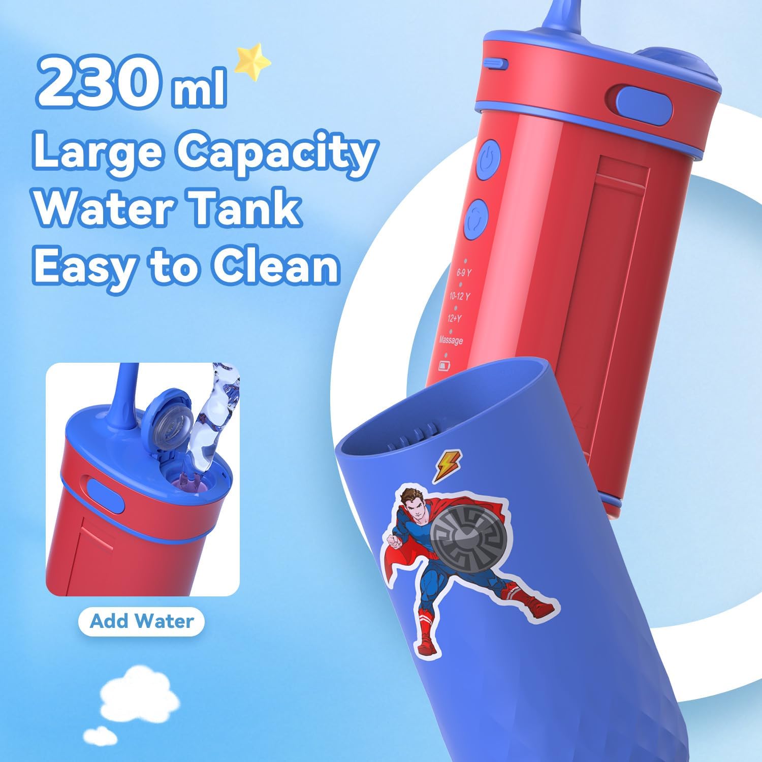 - [GENTLE AND SAFE DESIGN] The electric water flosser is made of safe food-grade materials, it's gentle, non-irritating and has stable water pressure that encourages children to rinse their mouths, helping them develop good oral cleaning habits. This water dental flosser can protect children's gum health, prevent bad breath, cavities and tooth decay.