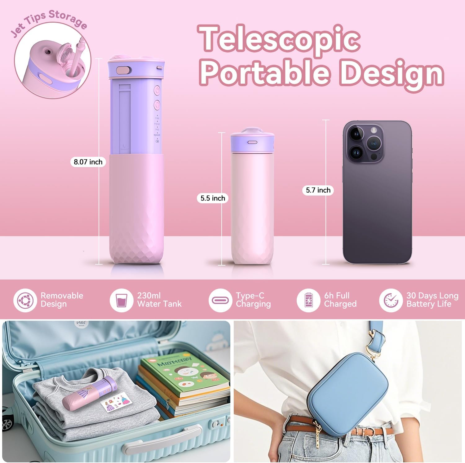 - [WHAT WILL KIDS GET] 1 x JTF Pink Kid Water Flosser, 3 x General Nozzles, 1 x Orthodontic Nozzle, 1 x Type-C Charger Cable (adapter not included), 1 x DIY Sticker Set, 1 x Travel Bag, 1 x User's Manual, and a 2-Year Product Warranty. For support, contact us within 24 hours.