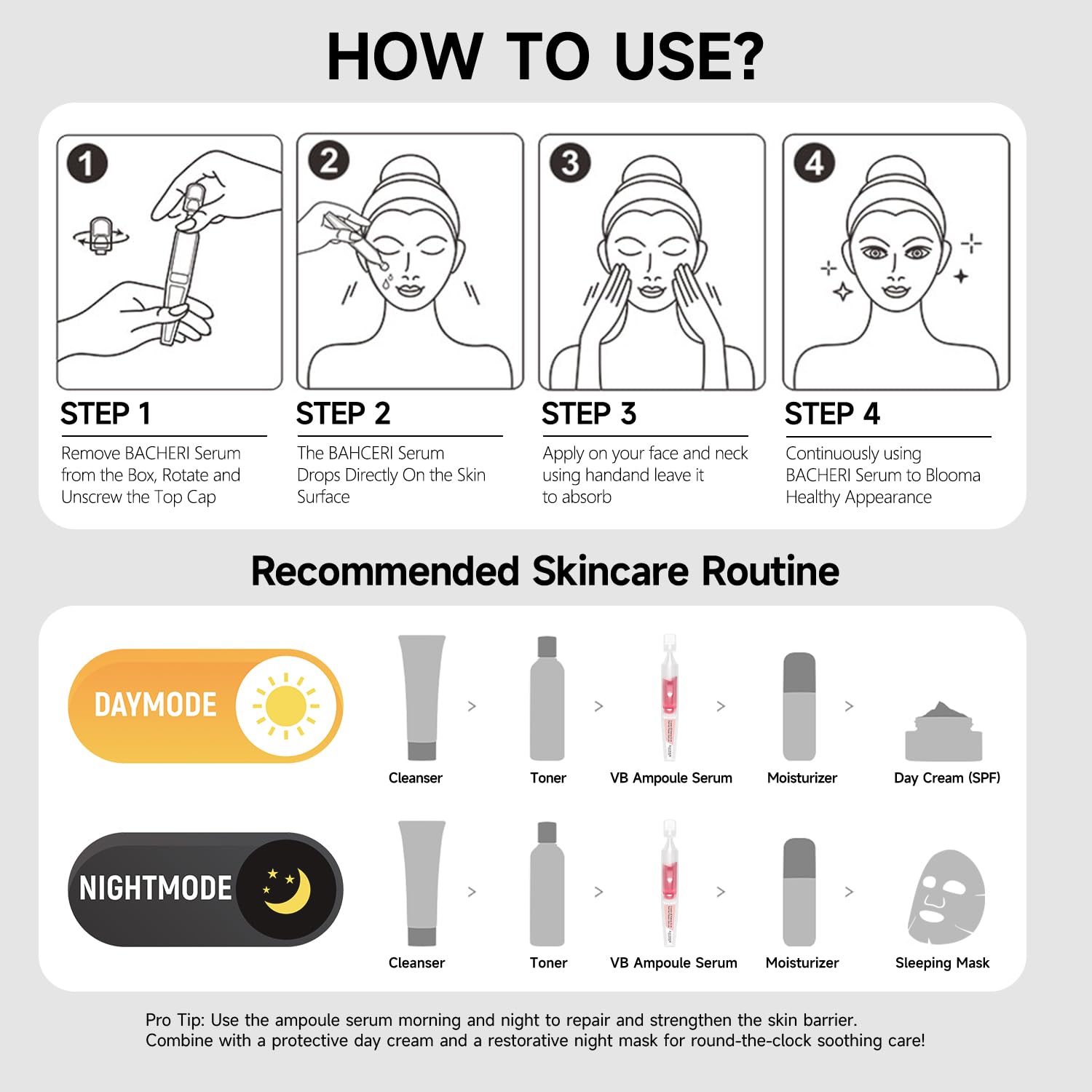 - Convenient BACHERI Ampoules Serums â Each 1.5ml ampoule delivers a hygienic, precisely measured dose, keeping the formula fresh and potent. Perfect for travel or daily use. How to Use: Hold the upper and lower parts of the ampoule, then use two fingers and snap to open.
