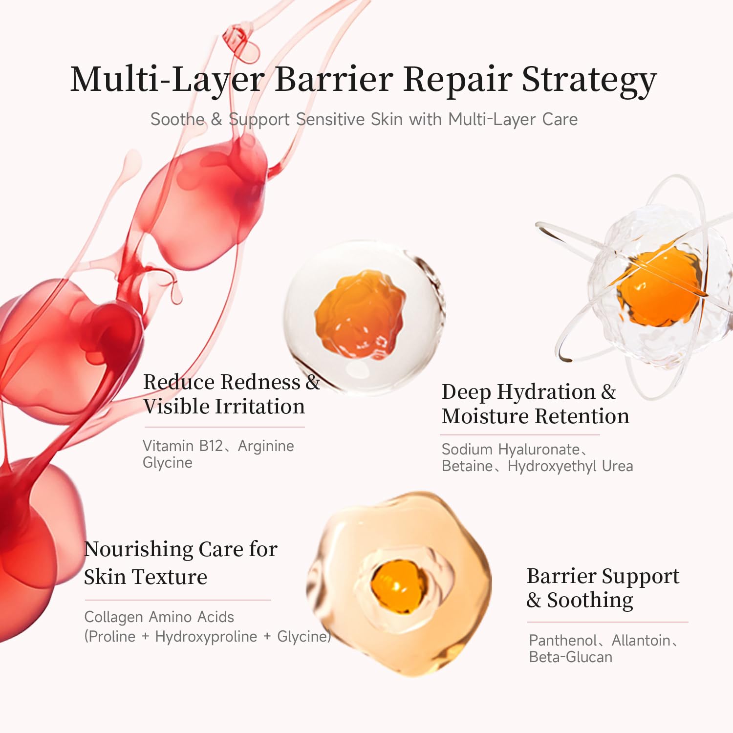 - Targeted Barrier Repair & Redness Relief â Powered by Amino Acids (Arginine, Proline, Hydroxyproline, Glycine) and Vitamin B12, this serum supports weakened skin barrier, helps calm redness, and improves resilience for sensitive skin.
