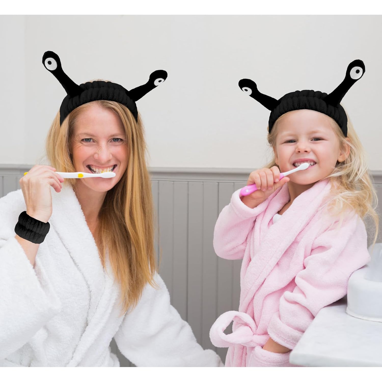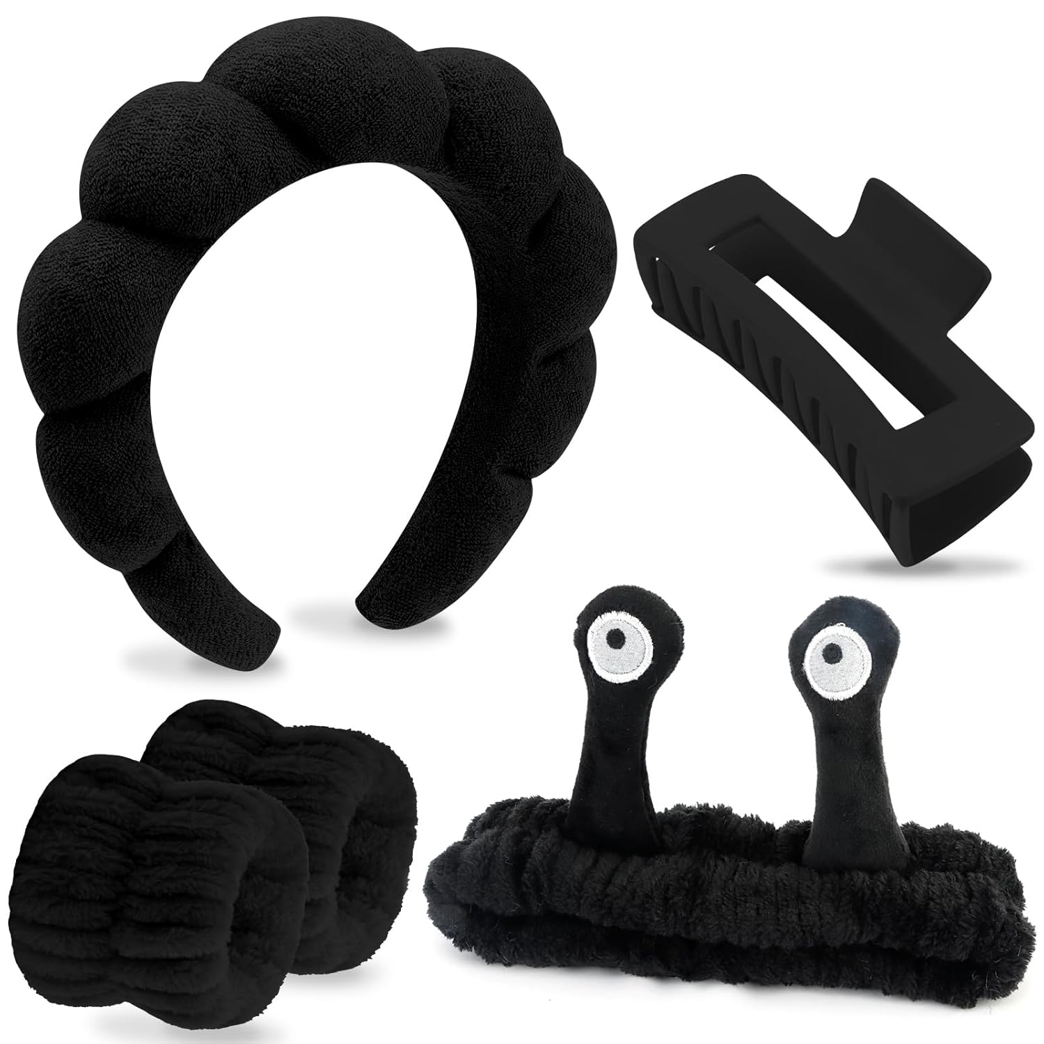 VELSCRUN Spa Headband, Makeup Face Wash Skincare Headbands, 5 Pcs Sponge Get Ready Snail Hairband Facial Wristband Hair Clip Set, Stuff for Teen Girls Women Trendy Hair Accessories Black
