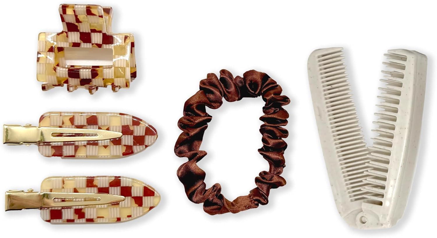 - STAY STYLISH ANYWHERE: Whether you're at work, school, the gym, or on the go, the BONKS GoGo Hair Care Kit keeps your hair looking polished and effortless. Includes a curated set of everyday essentials: mini claw clip, two seamless hair pins, silky brown hair tie, and a foldable ivory wheatgrass comb.