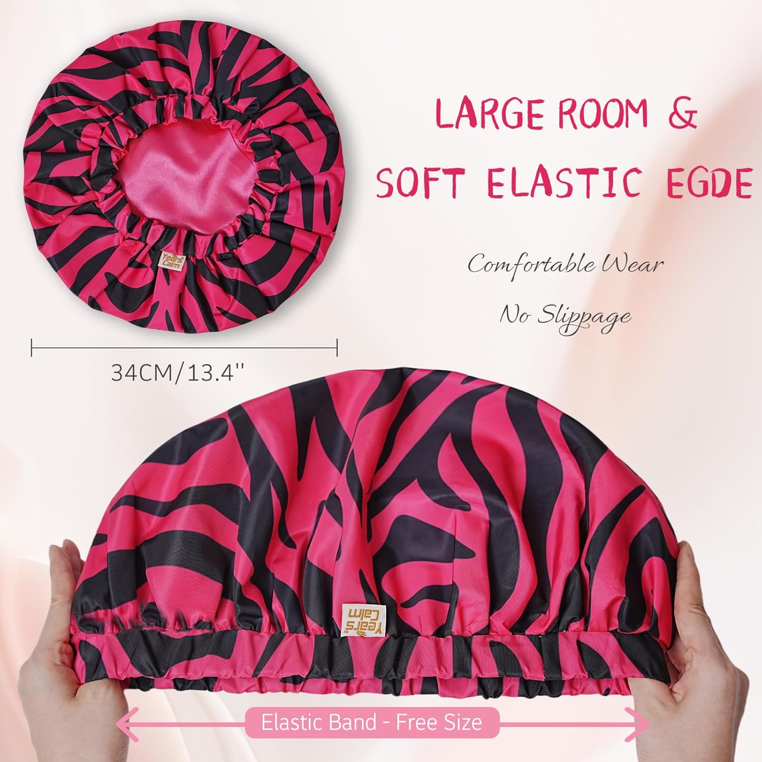 Years Calm Shower Caps for Women Reusable Waterproof, Double-Layer Extra Large Elastic Hair Cap for Shower for Long Hair & Braids, Travel & Home (Pink)