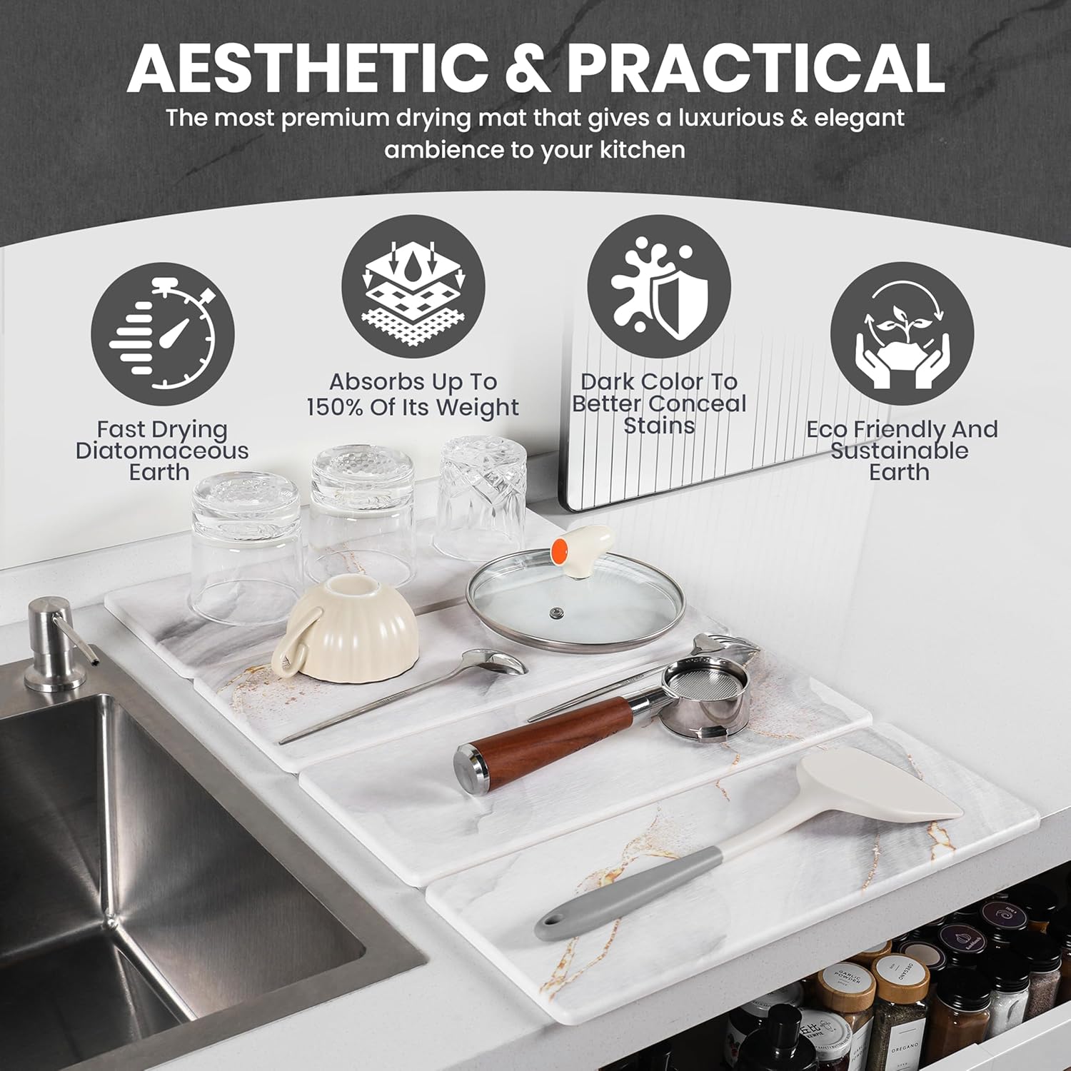 - 【STONE DISH DRYING MAT】Dusk & Decor 4 pieces foldable stone dish drying mat is a safe and beautiful addition to your kitchen, boasting super absorbent diatomaceous stone to absorb moisture within seconds and quickly dries within minutes, keeping your countertop dry and spotless. The kitchen drying mat easily folds for storage in a drawer when not in use.